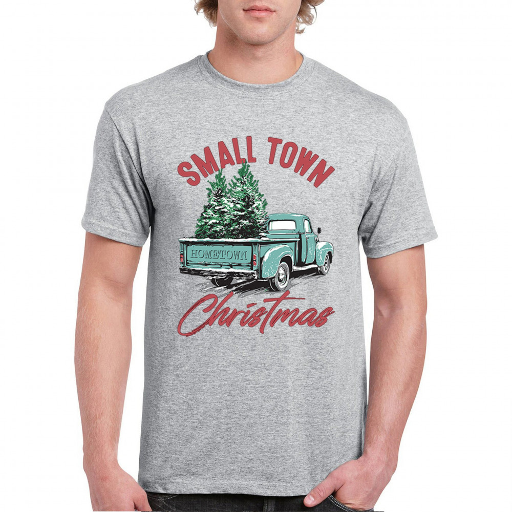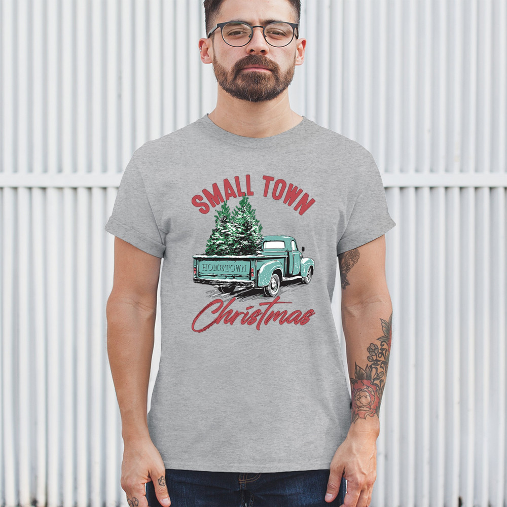 Embrace holiday nostalgia with this "Small Town Christmas" design featuring a vintage truck and Christmas trees. Perfect for rustic decor lovers.