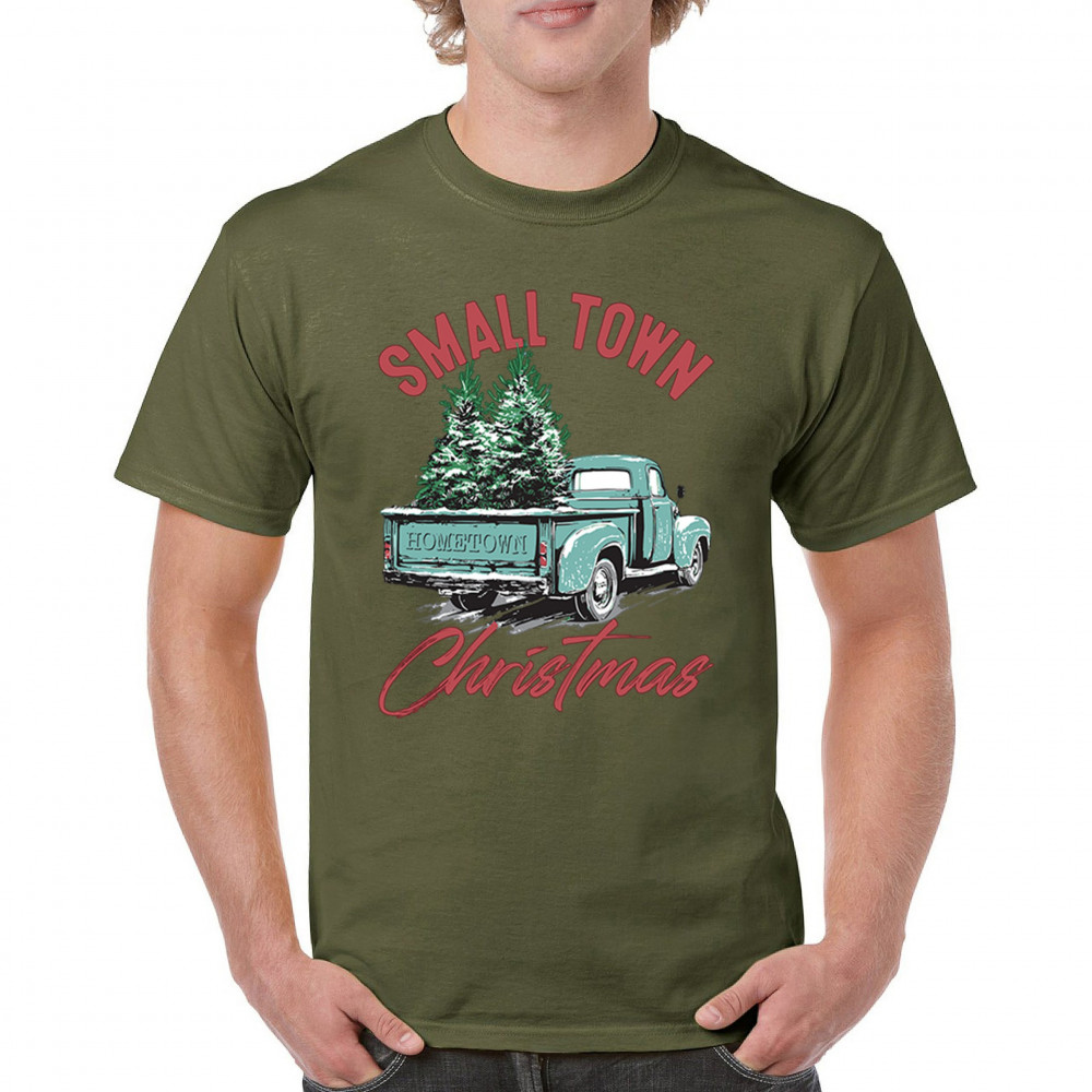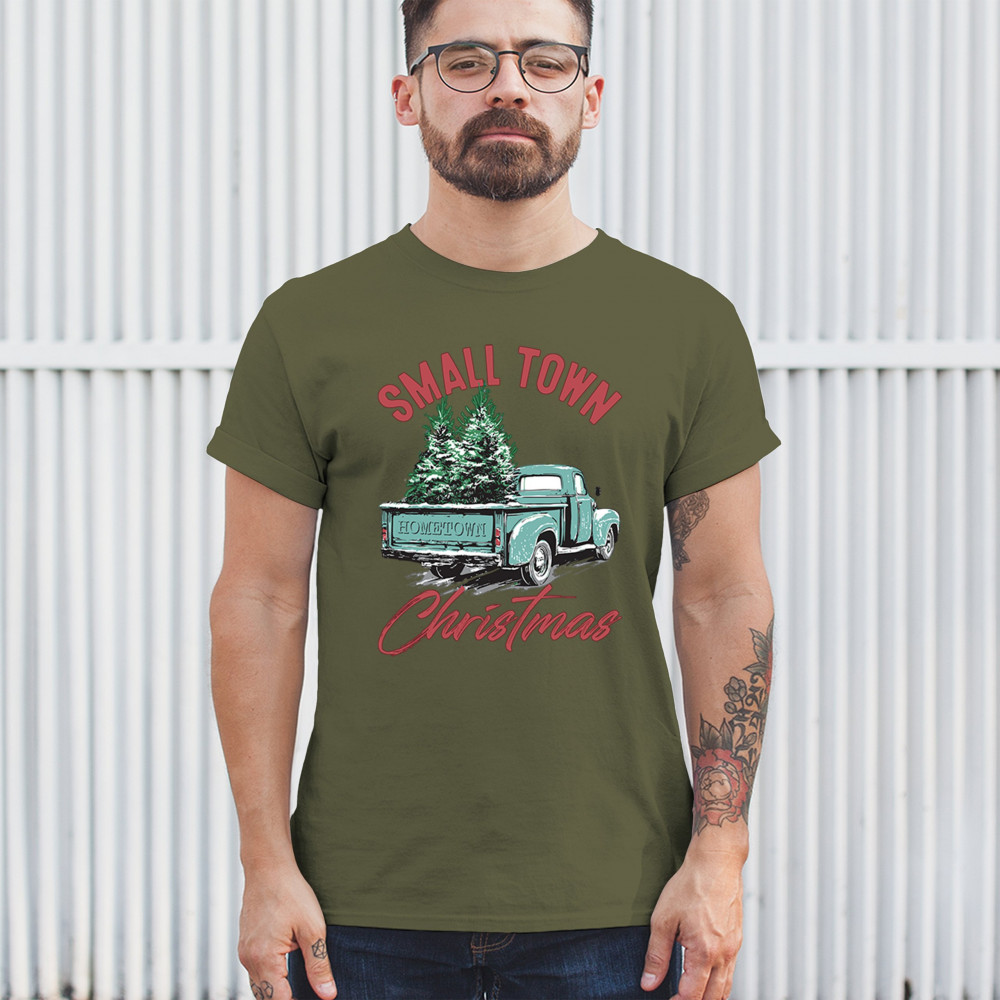 Embrace holiday nostalgia with this "Small Town Christmas" design featuring a vintage truck and Christmas trees. Perfect for rustic decor lovers.