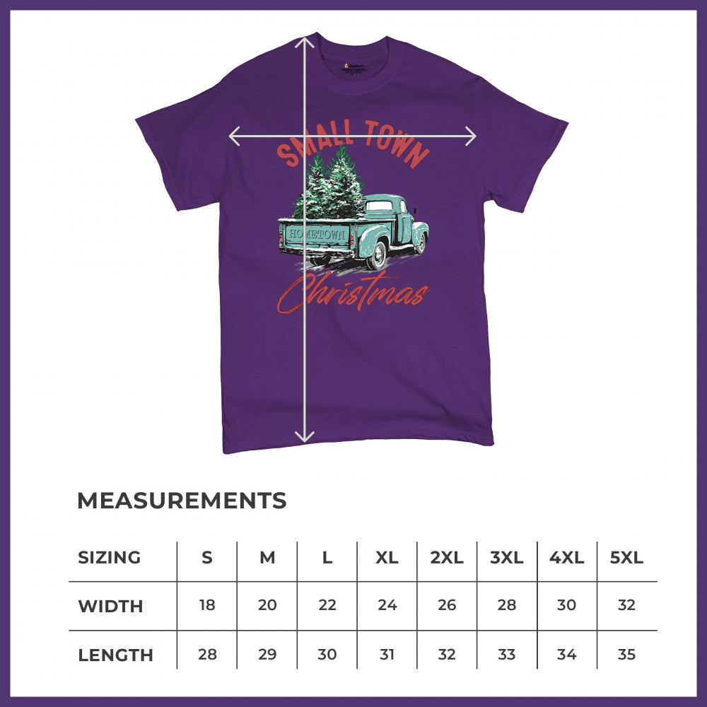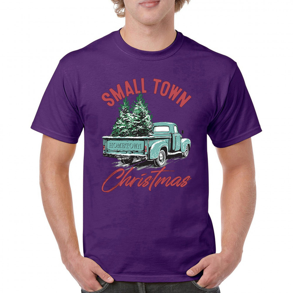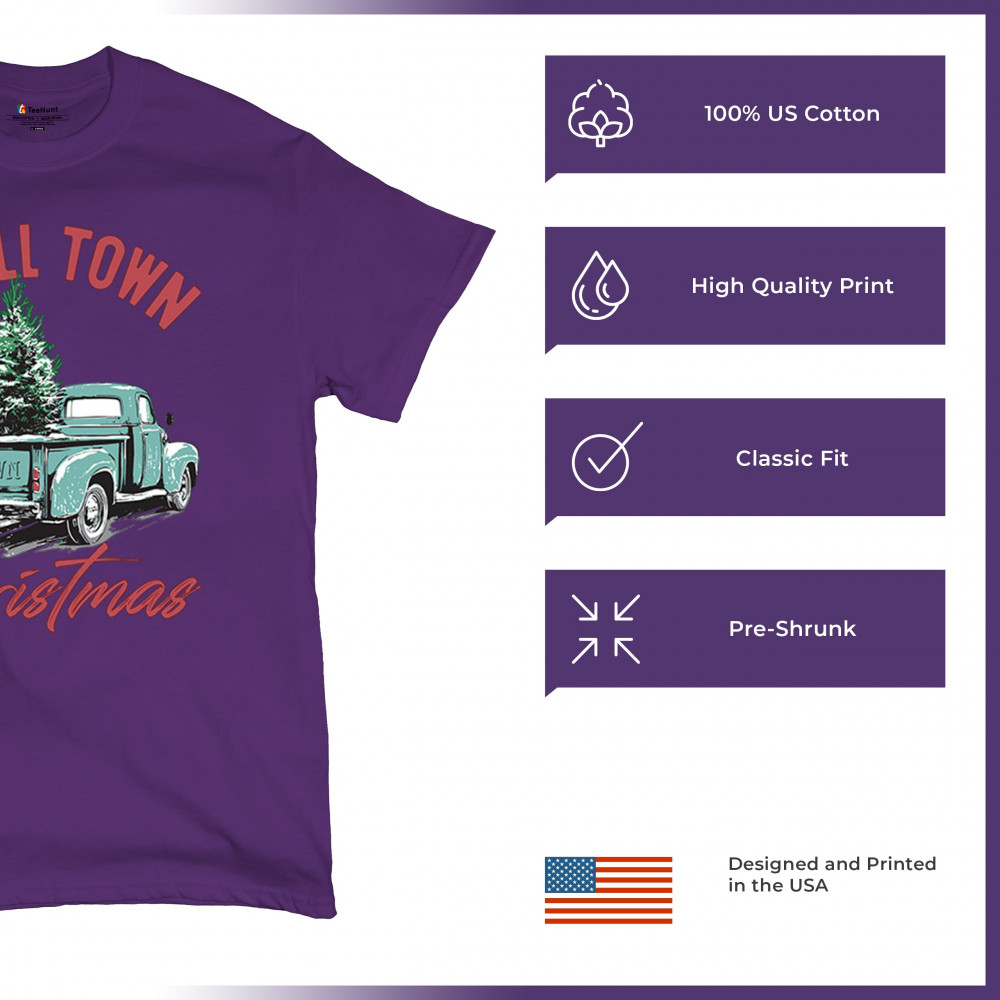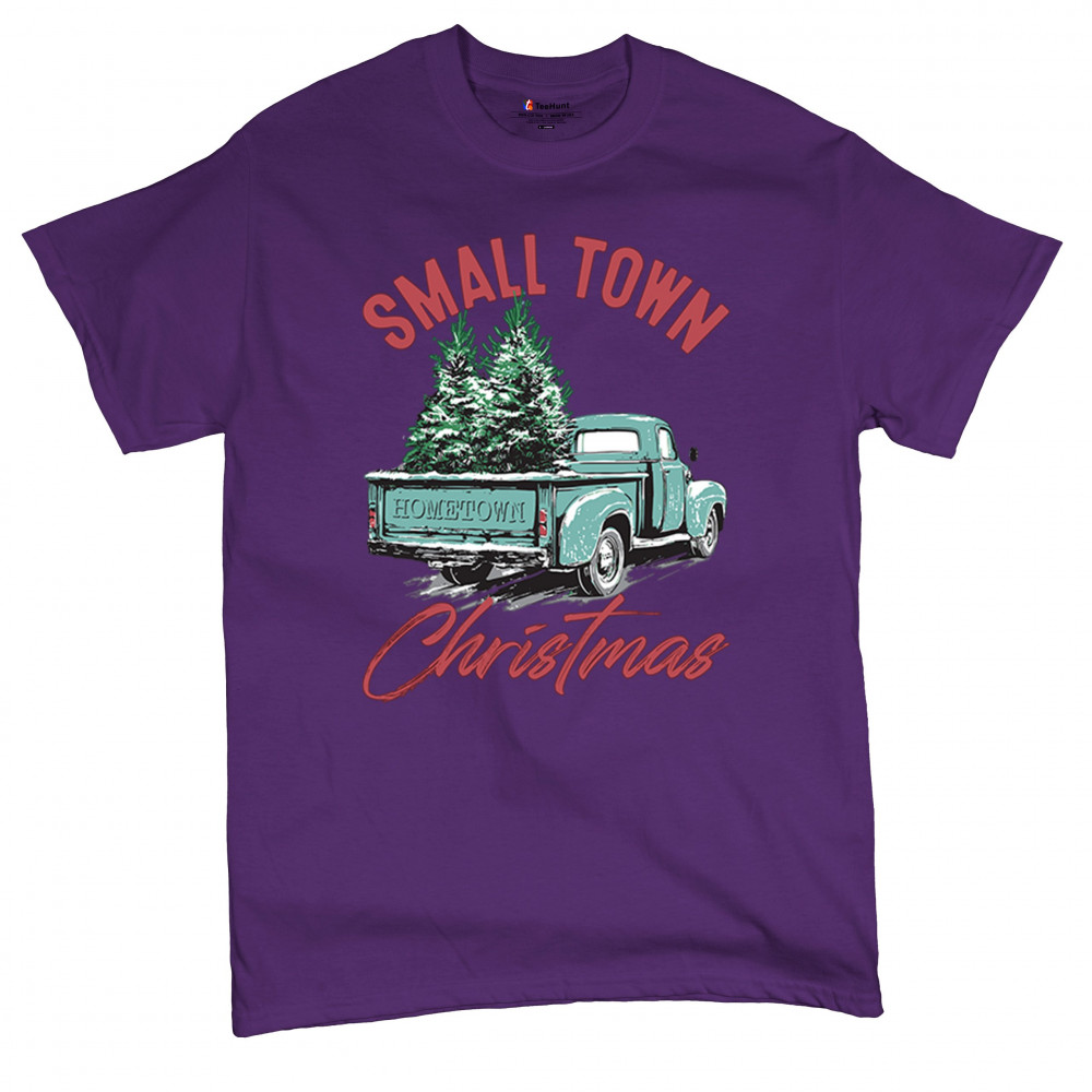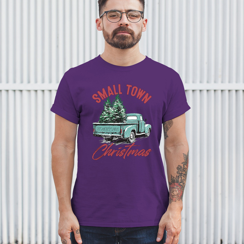 Embrace holiday nostalgia with this "Small Town Christmas" design featuring a vintage truck and Christmas trees. Perfect for rustic decor lovers.