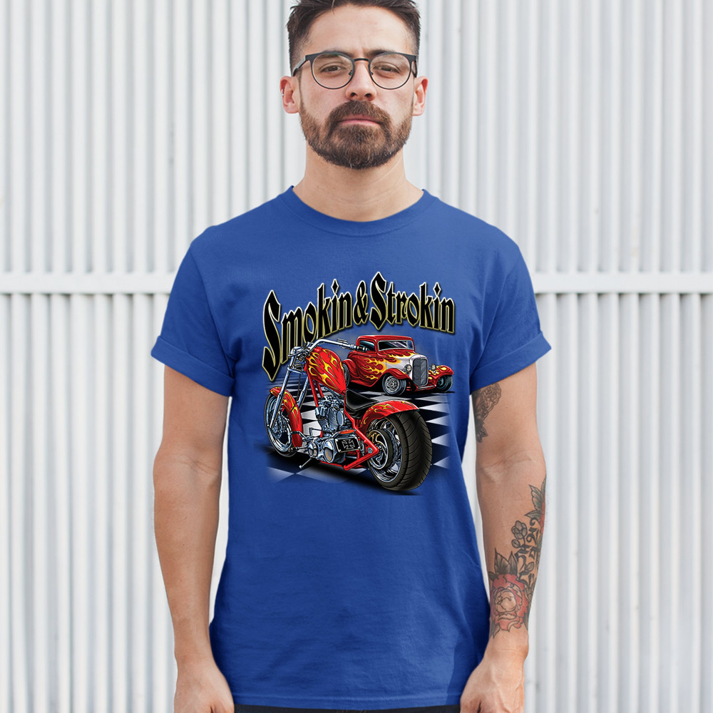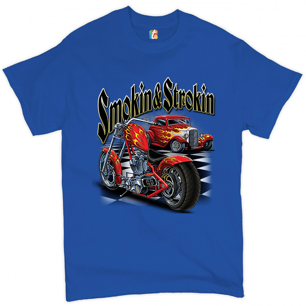 SMOKIN & STROKIN t-shirt chopper biker hot rod live to ride men's tee royal blue