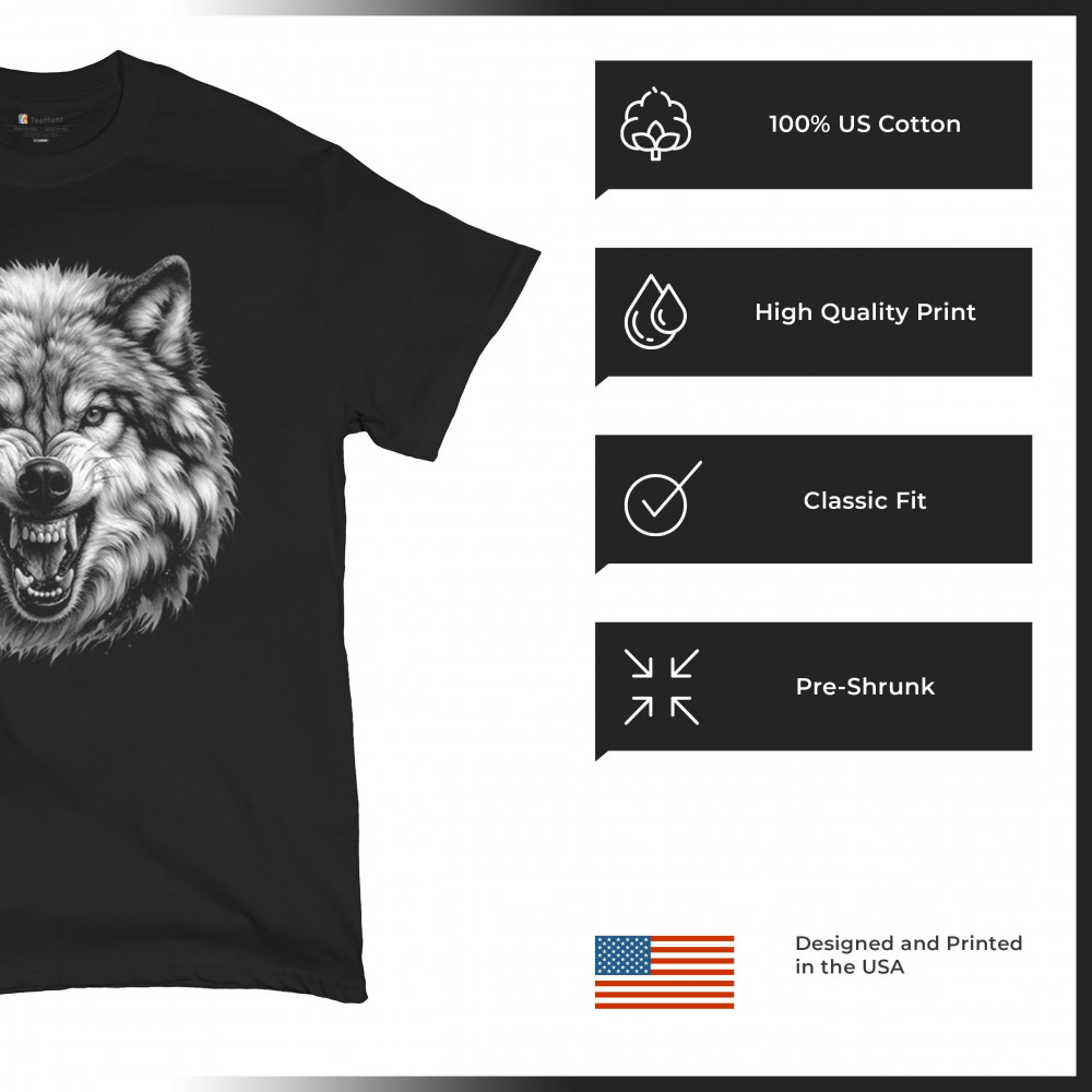 Snarling wolf design with fierce detail and wild spirit. Great for hunters, survivalists, and outdoor alpha energy wear.