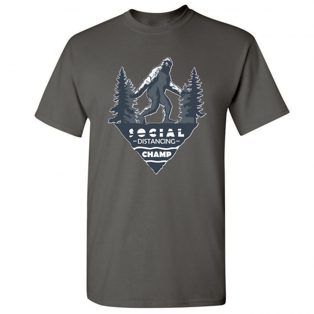 SOCIAL DISTANCING CHAMP t-shirt funny bigfoot yeti virus quarantine men's tee charcoal