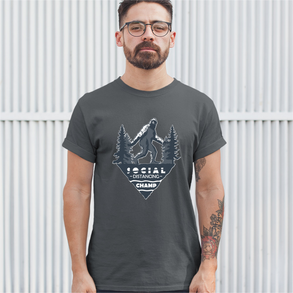 A funny print featuring a sasquatch walking through the woods. Beneath, it says: "social distancing champ". A great choice to wear or to give your friend or family member as a gift during a time of quarantine when everyone should stay at home.