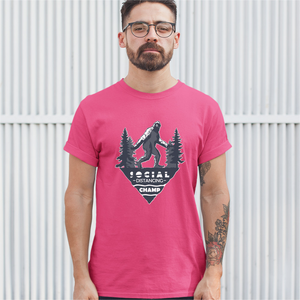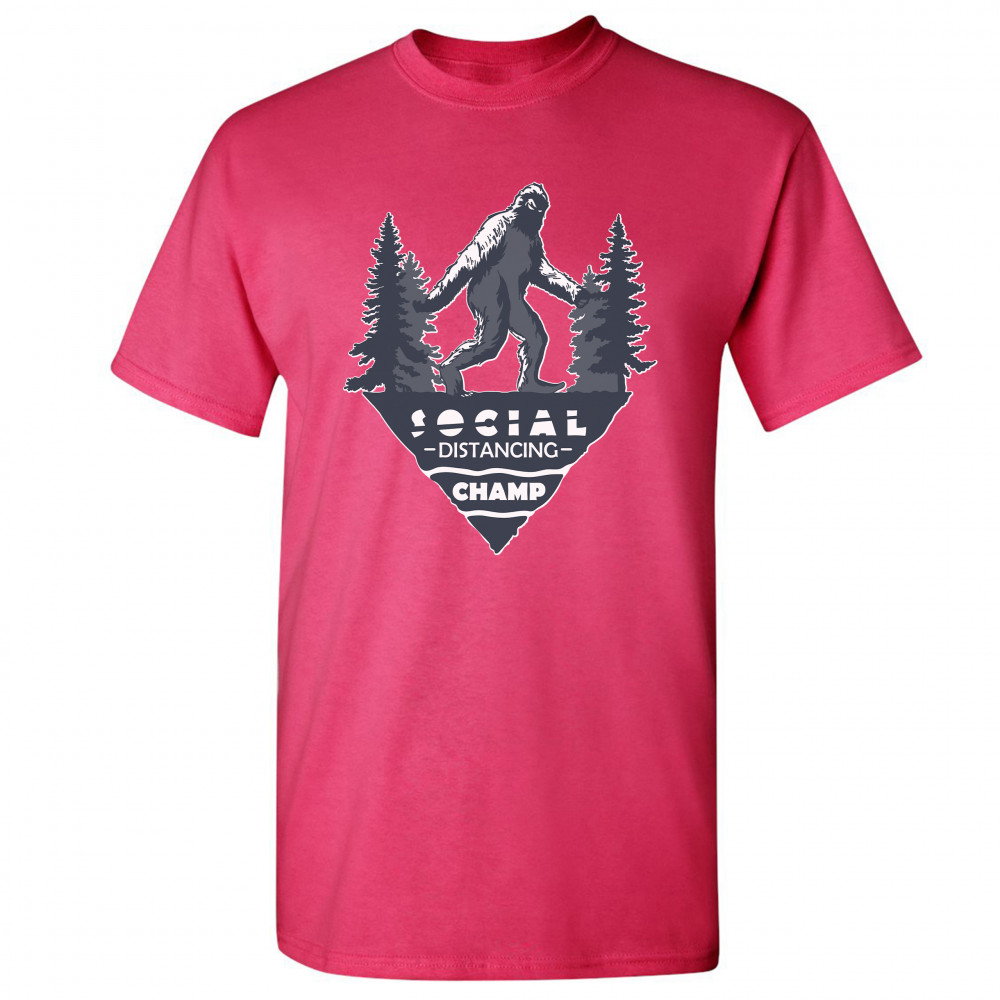 SOCIAL DISTANCING CHAMP t-shirt funny bigfoot yeti virus quarantine men's tee hot pink
