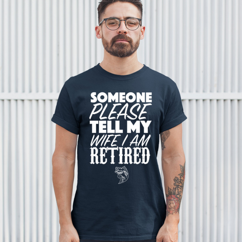 SOMEONE PLEASE TELL MY WIFE I AM RETIRED t-shirt father's day men's tee navy blue