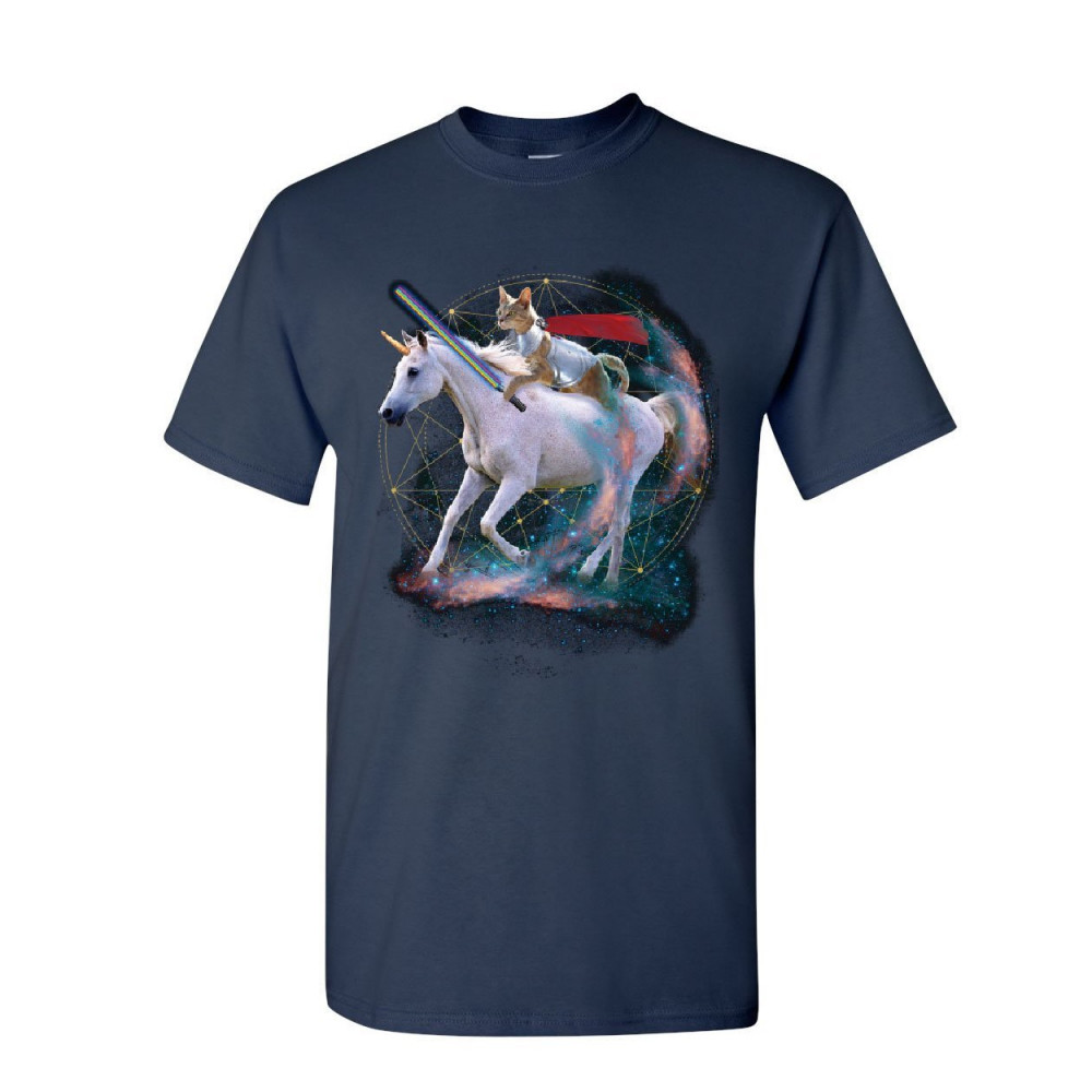 SPACE CAT RIDING A UNICORN with a saber t-shirt weird universe mens tee shirt navy blue