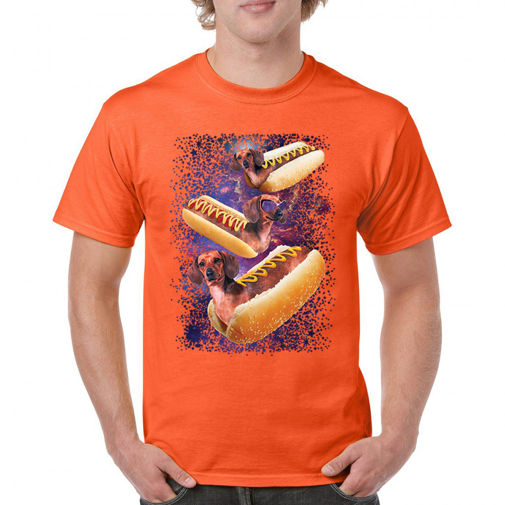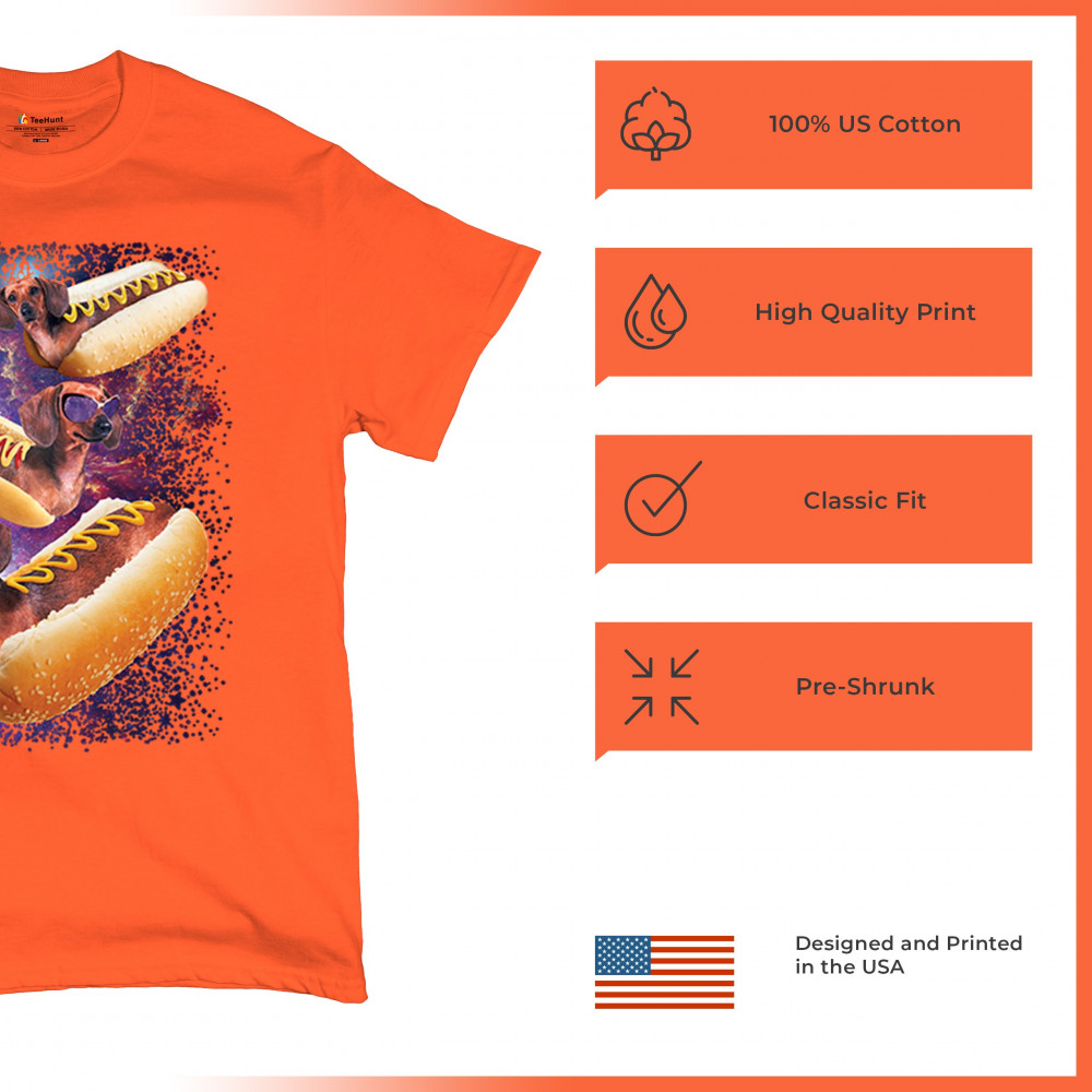 Quirky and fun tee featuring dachshunds as hotdogs in a cosmic setting. Perfect for dog and space lovers. Comfortable and durable.