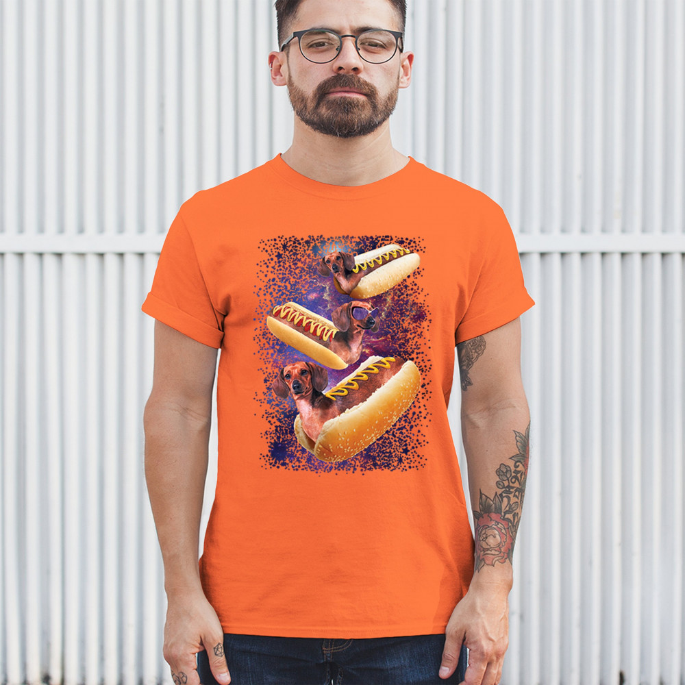 Add a dash of humor to your wardrobe with our unique design featuring adorable dachshunds as hotdogs in a cosmic setting. This playful graphic is perfect for animal lovers and those with a quirky sense of style. The vibrant colors and detailed illustration ensure you stand out in any crowd. Made from premium materials, this tee offers both comfort and durability, making it ideal for everyday wear or special occasions. Embrace your love for dogs and space with this fun and imaginative design.