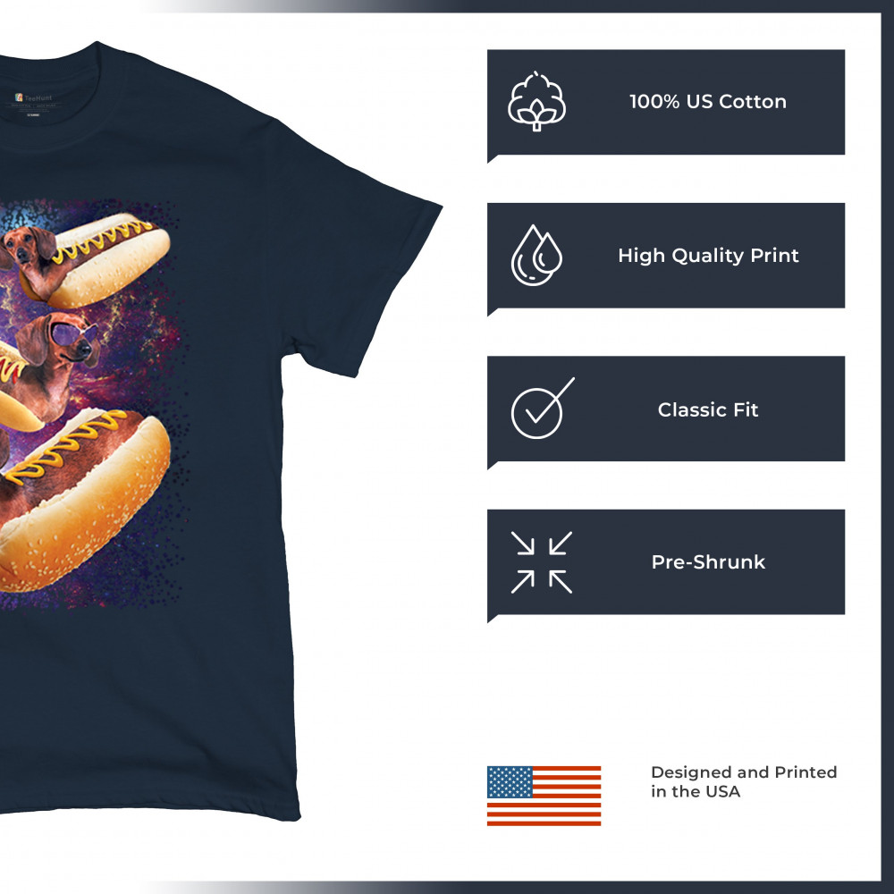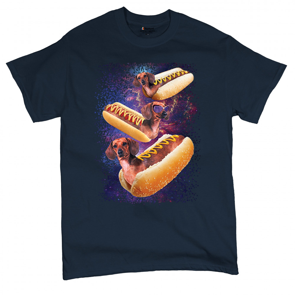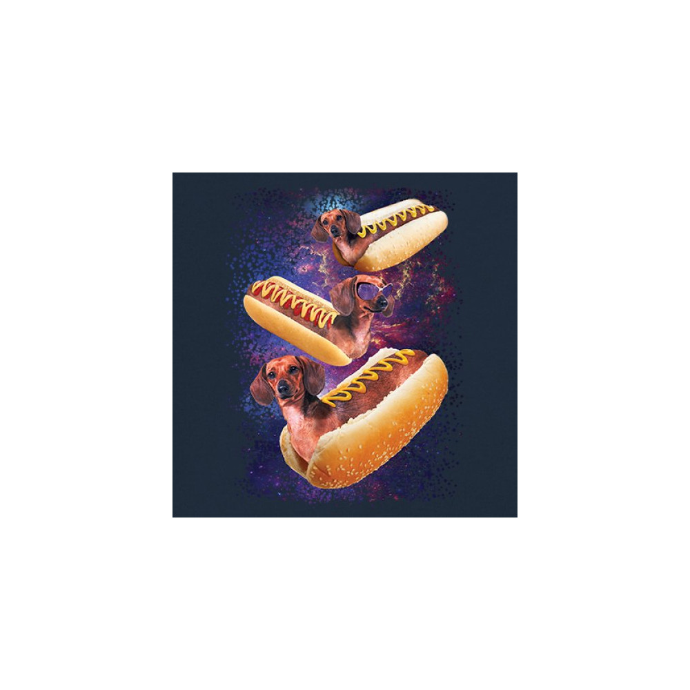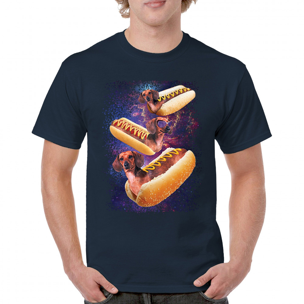 Quirky and fun tee featuring dachshunds as hotdogs in a cosmic setting. Perfect for dog and space lovers. Comfortable and durable.