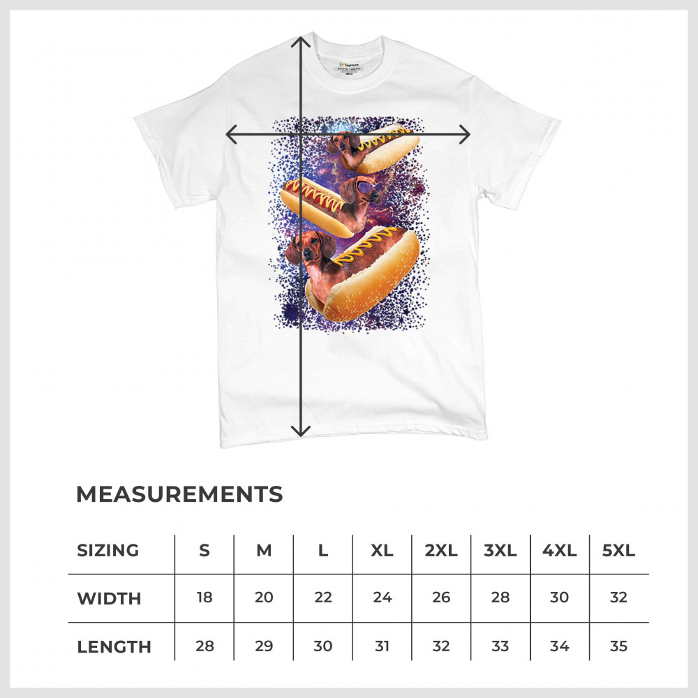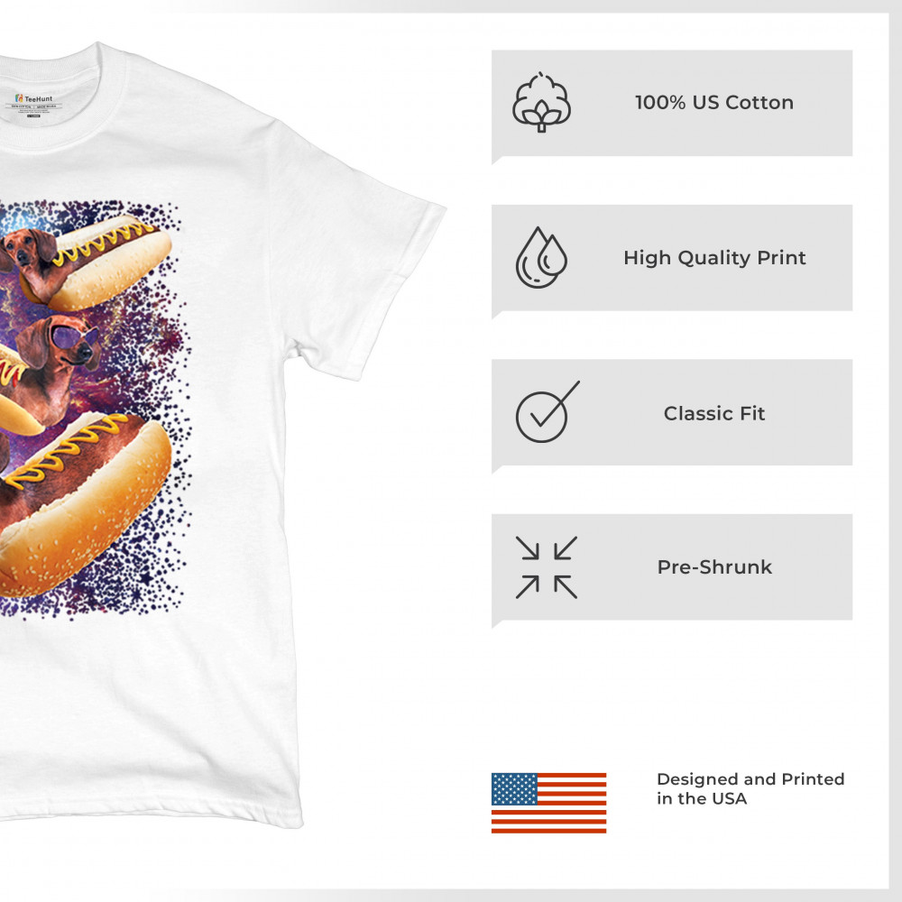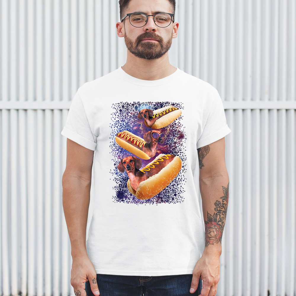 Add a dash of humor to your wardrobe with our unique design featuring adorable dachshunds as hotdogs in a cosmic setting. This playful graphic is perfect for animal lovers and those with a quirky sense of style. The vibrant colors and detailed illustration ensure you stand out in any crowd. Made from premium materials, this tee offers both comfort and durability, making it ideal for everyday wear or special occasions. Embrace your love for dogs and space with this fun and imaginative design.