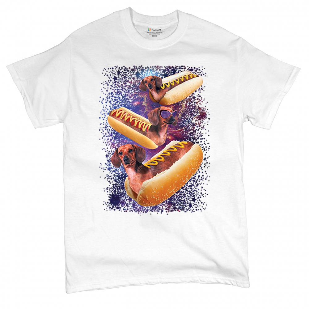 Quirky and fun tee featuring dachshunds as hotdogs in a cosmic setting. Perfect for dog and space lovers. Comfortable and durable.