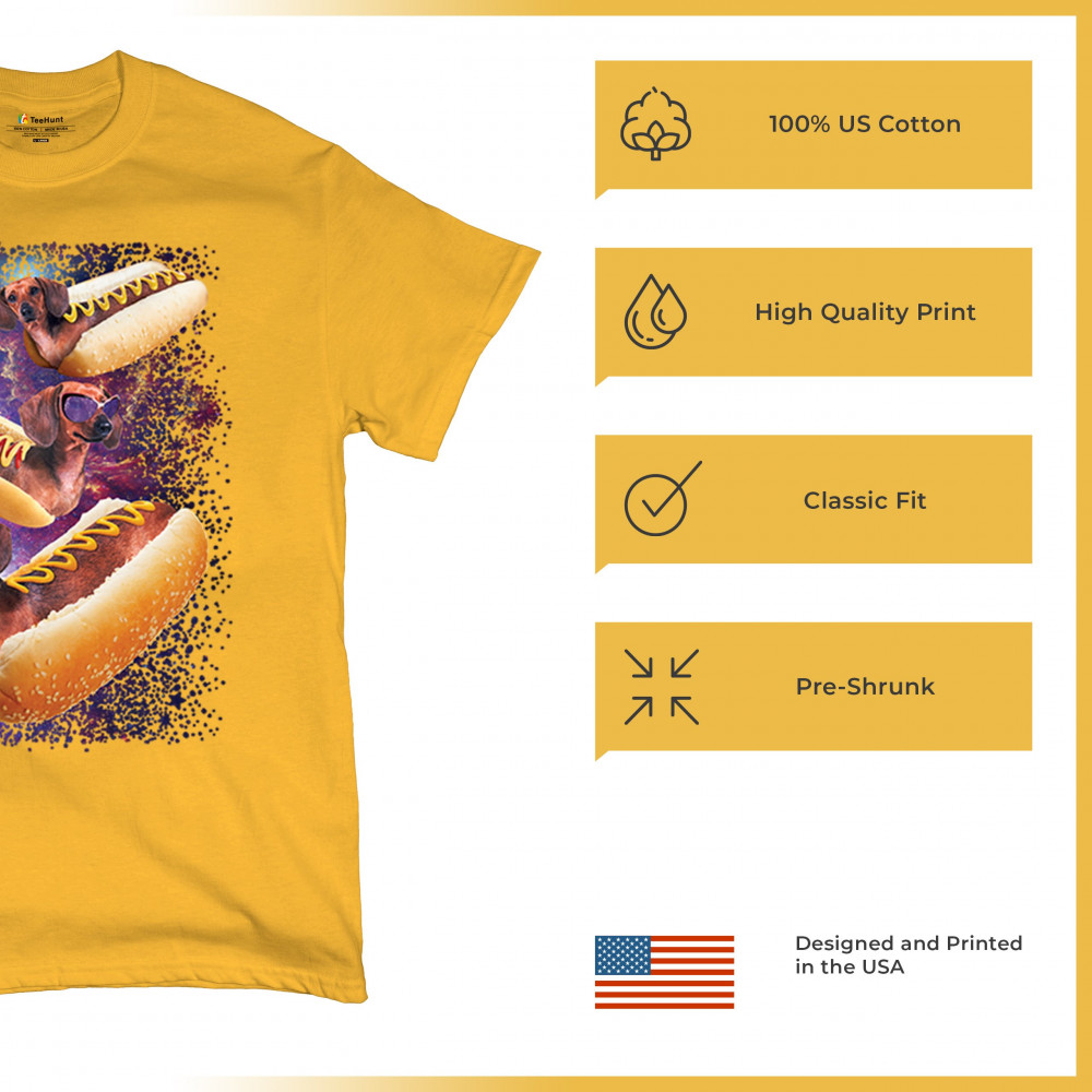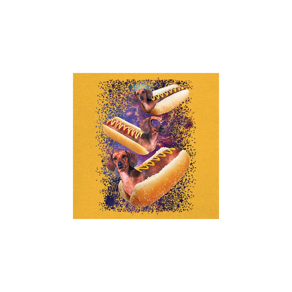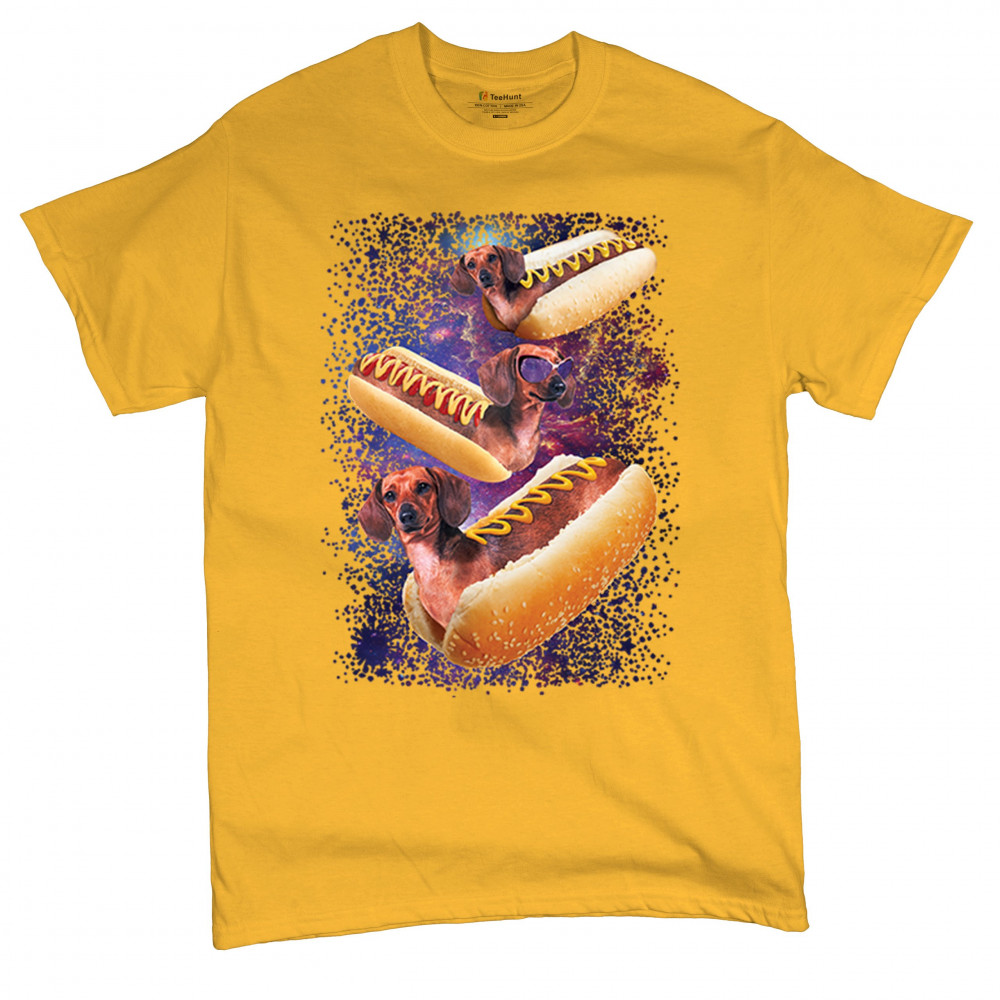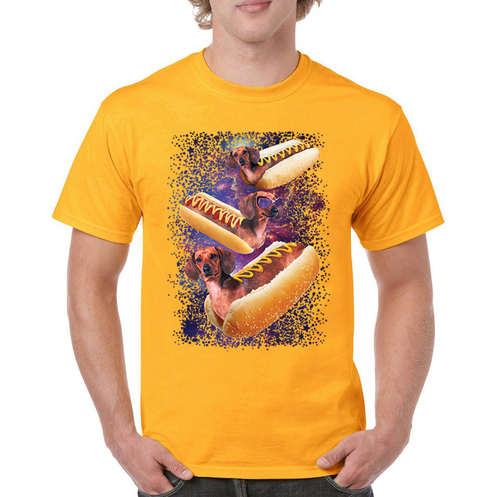 Quirky and fun tee featuring dachshunds as hotdogs in a cosmic setting. Perfect for dog and space lovers. Comfortable and durable.