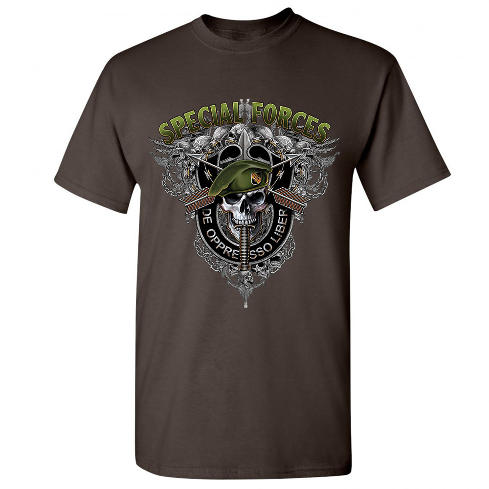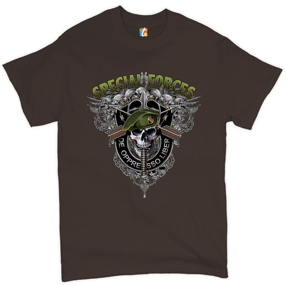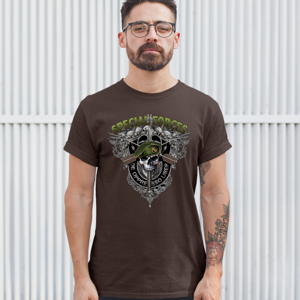 A patriotic print featuring a skull wearing a green beret with a dagger in it's mouth. At the top the print says: "Special Forces". Around the skull there is a black stripe with the special forces' slogan written on it: "de oppresso liber". In the backgro