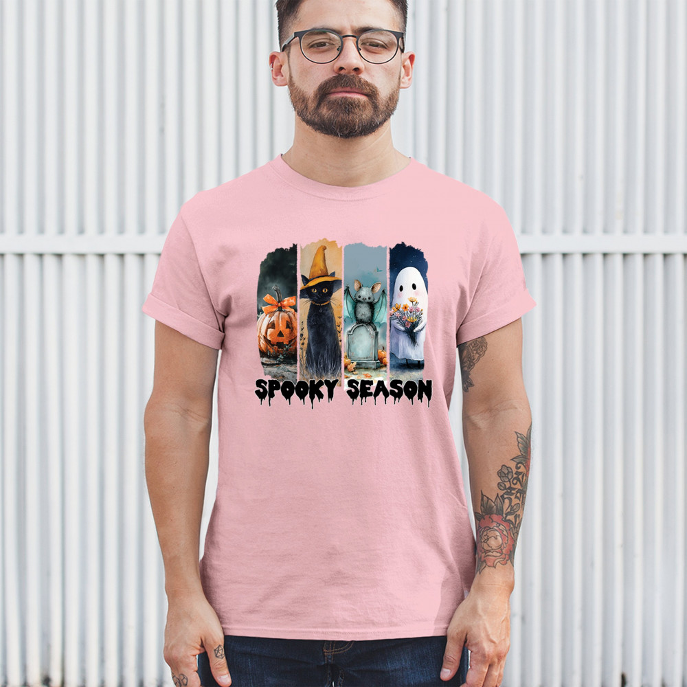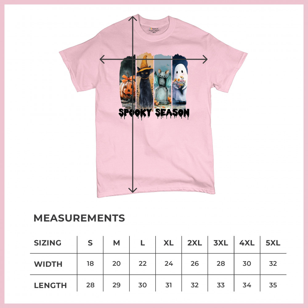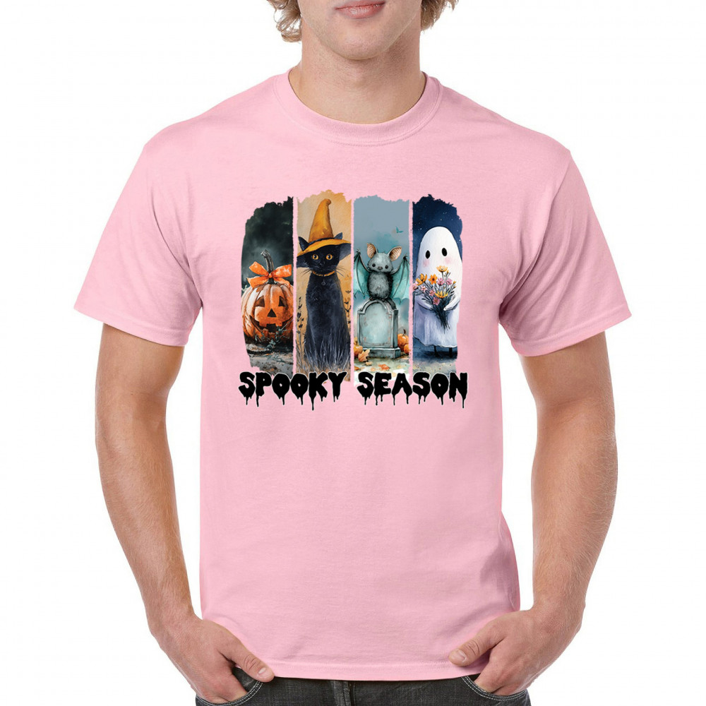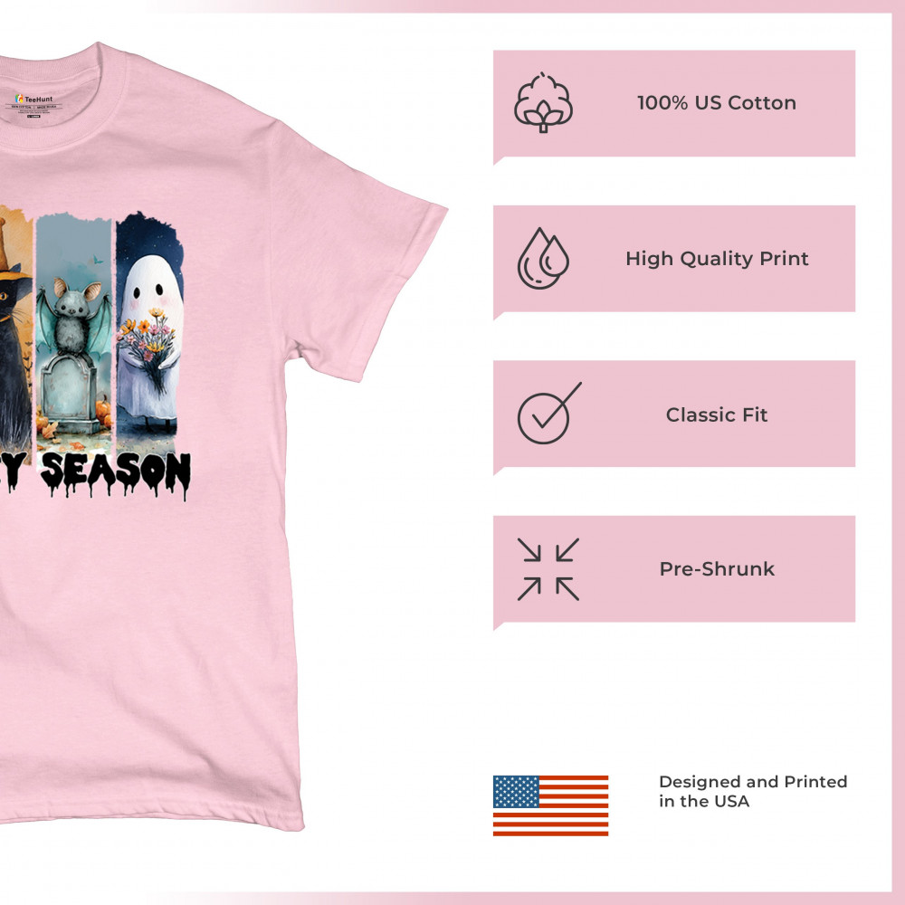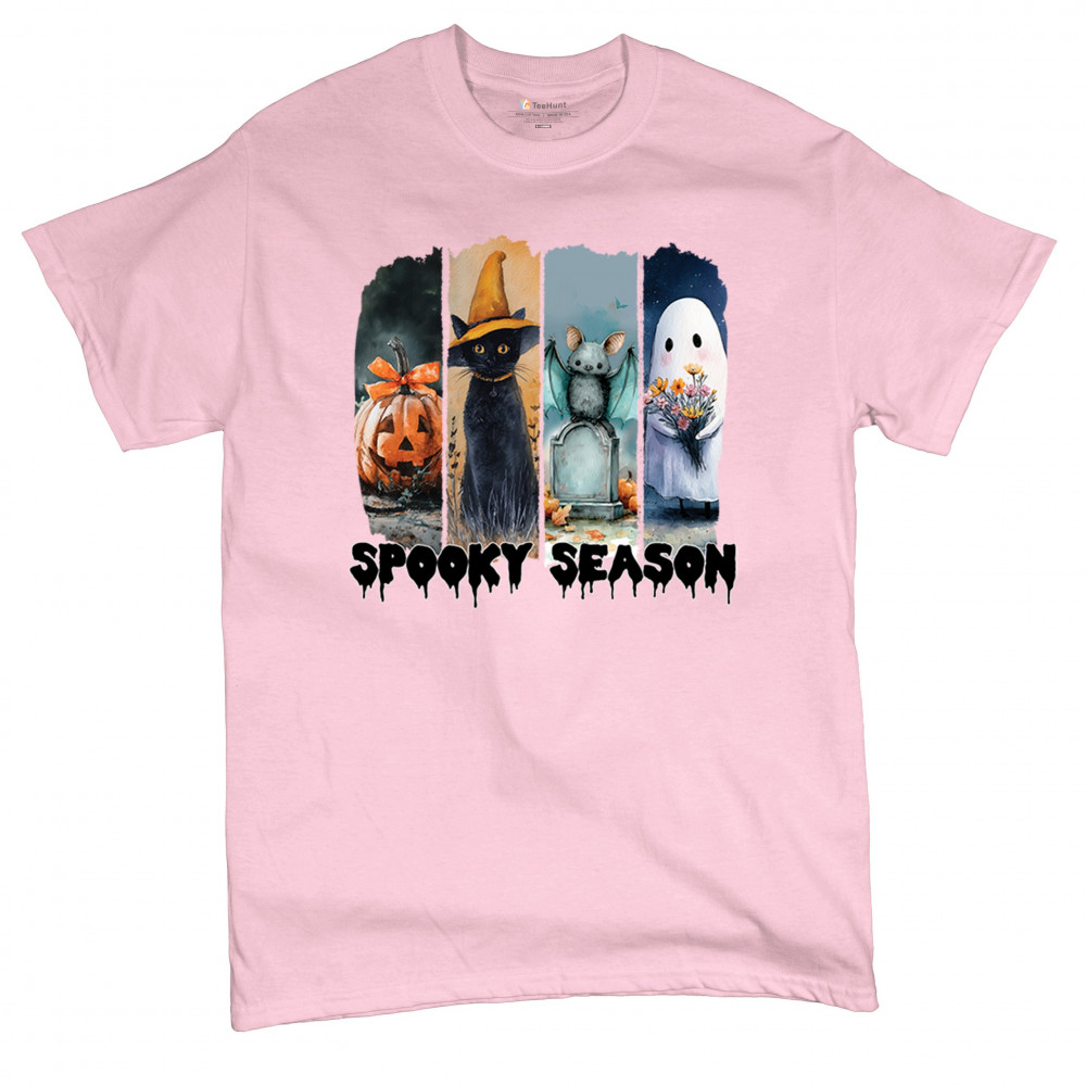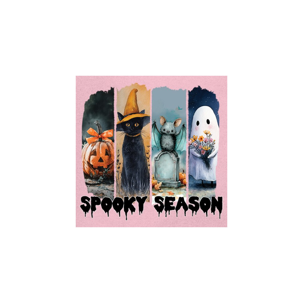 Spooky Season design with scary black cat, jack o lantern, haunted ghost house, and cute ghost. Perfect for October 31, trick or treat, and fall fun.