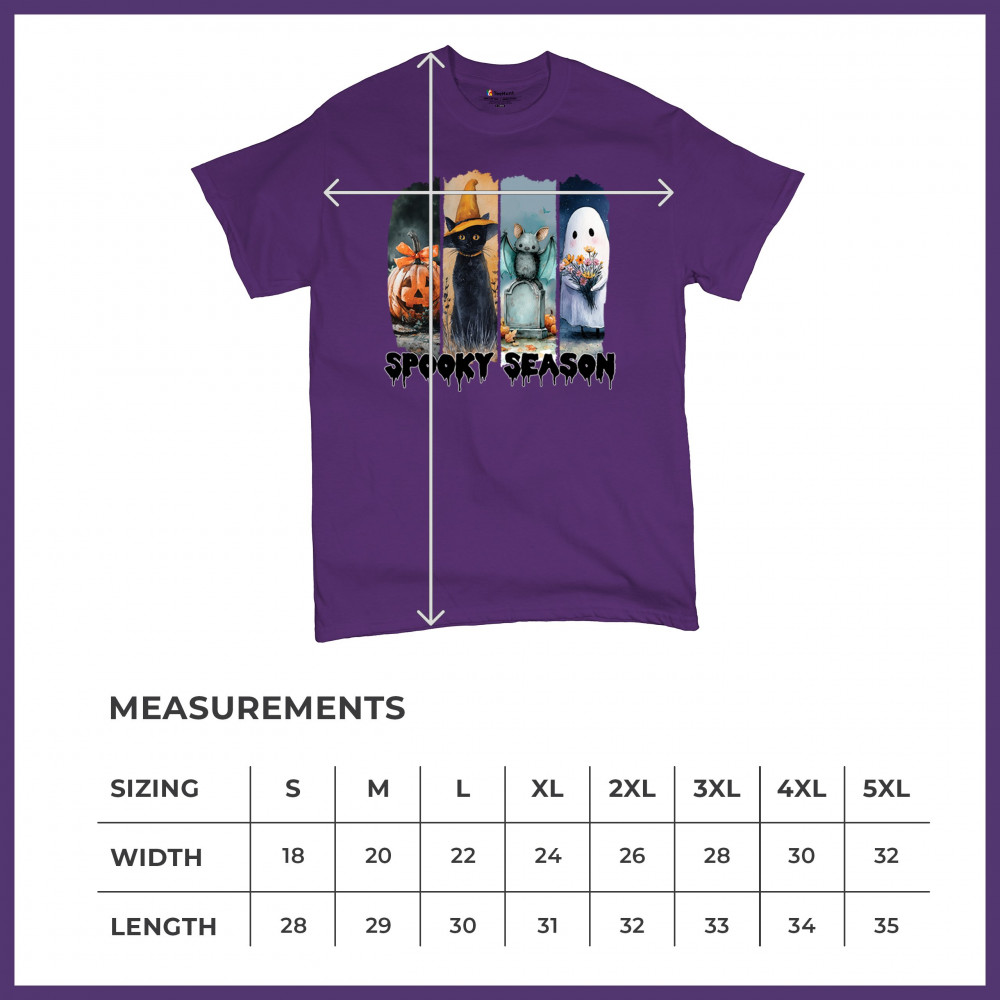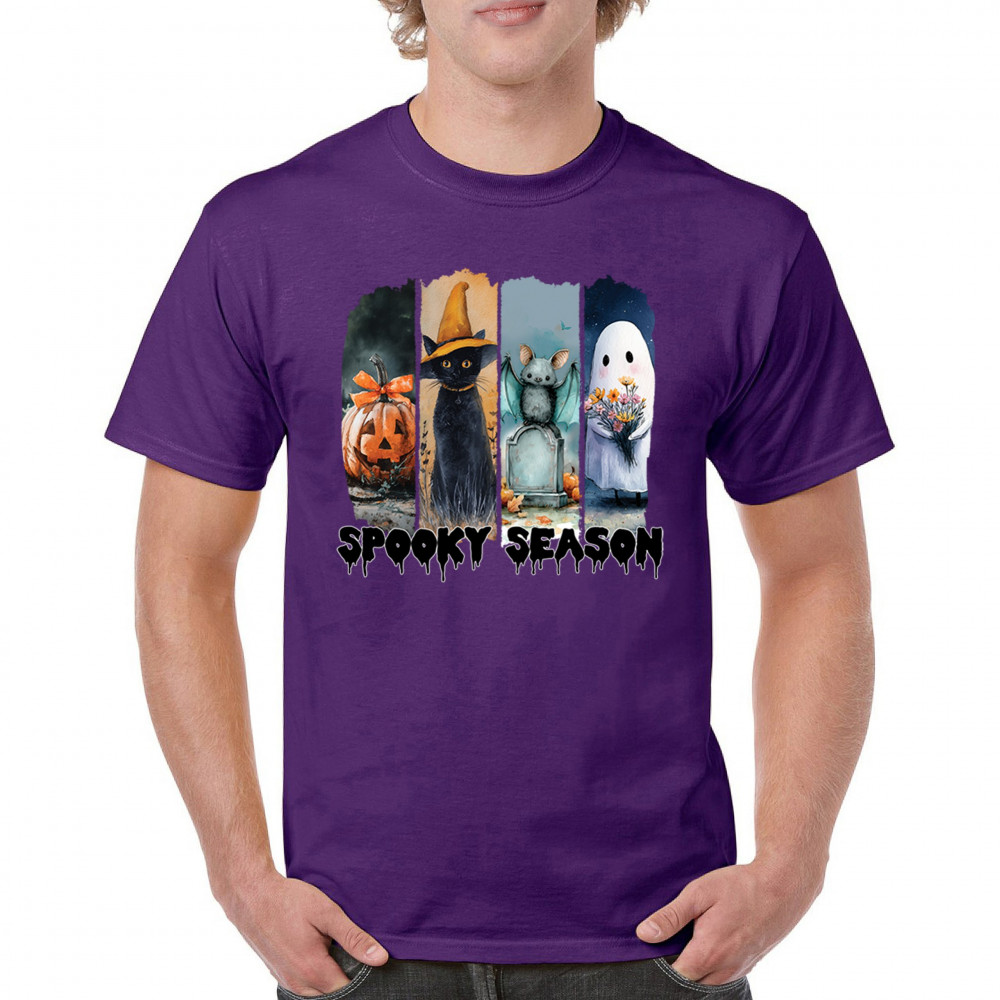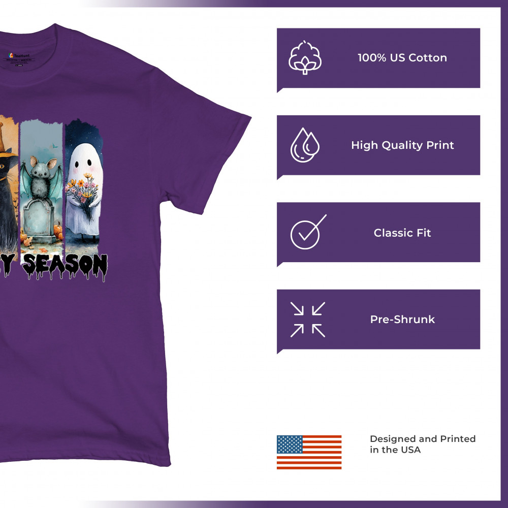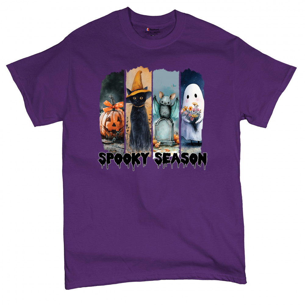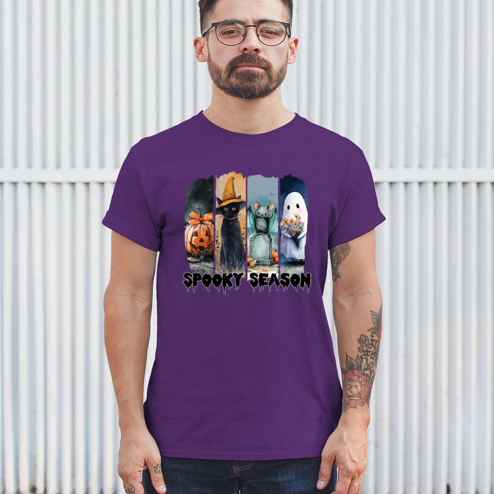 Spooky Season design with scary black cat, jack o lantern, haunted ghost house, and cute ghost. Perfect for October 31, trick or treat, and fall fun.