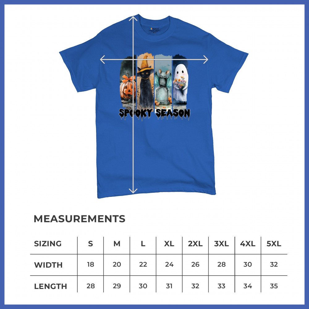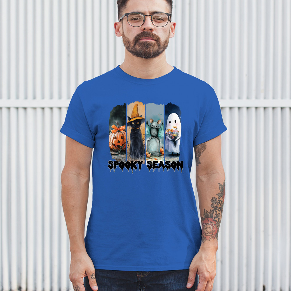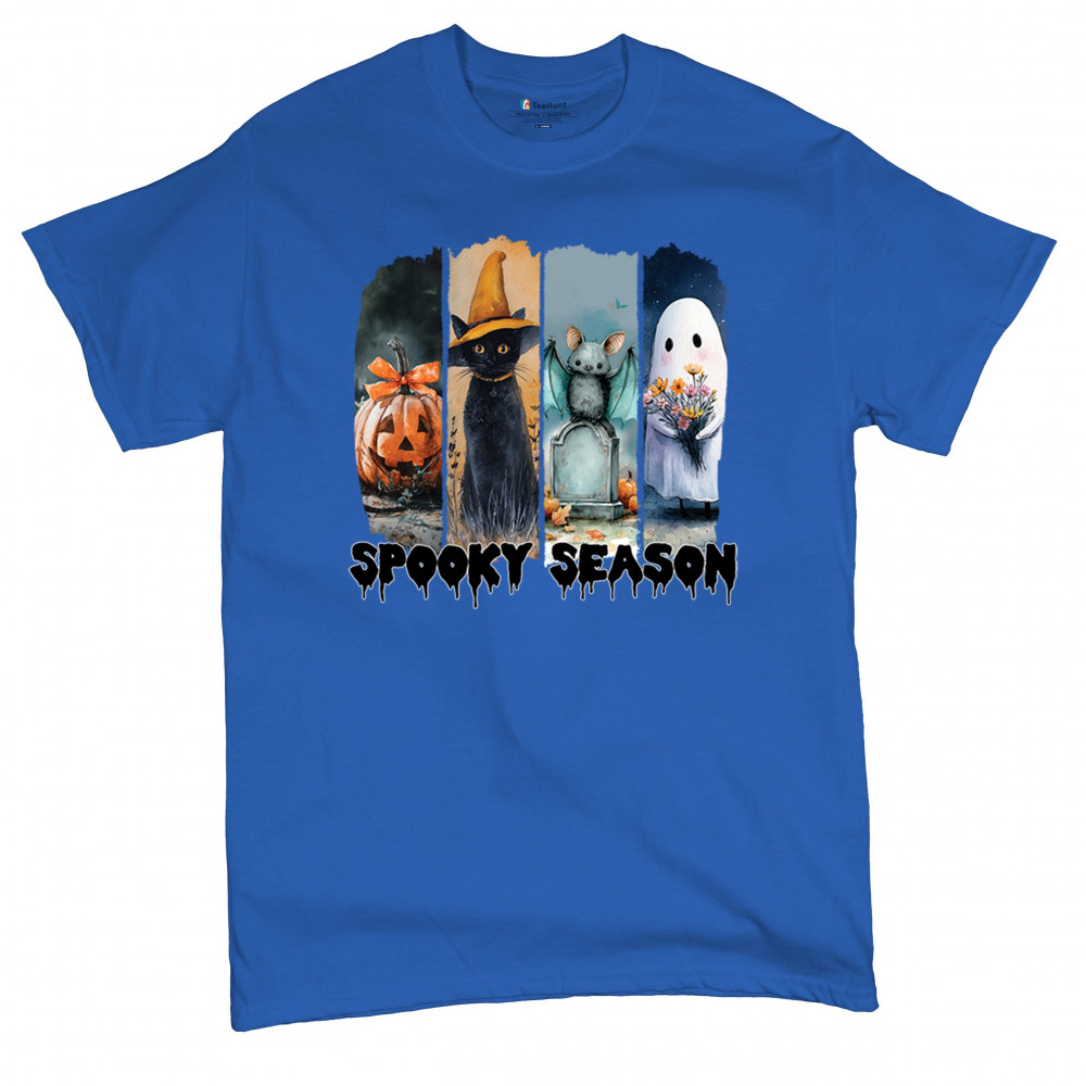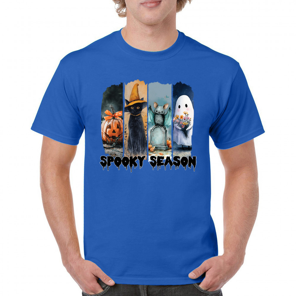 Spooky Season design with scary black cat, jack o lantern, haunted ghost house, and cute ghost. Perfect for October 31, trick or treat, and fall fun.