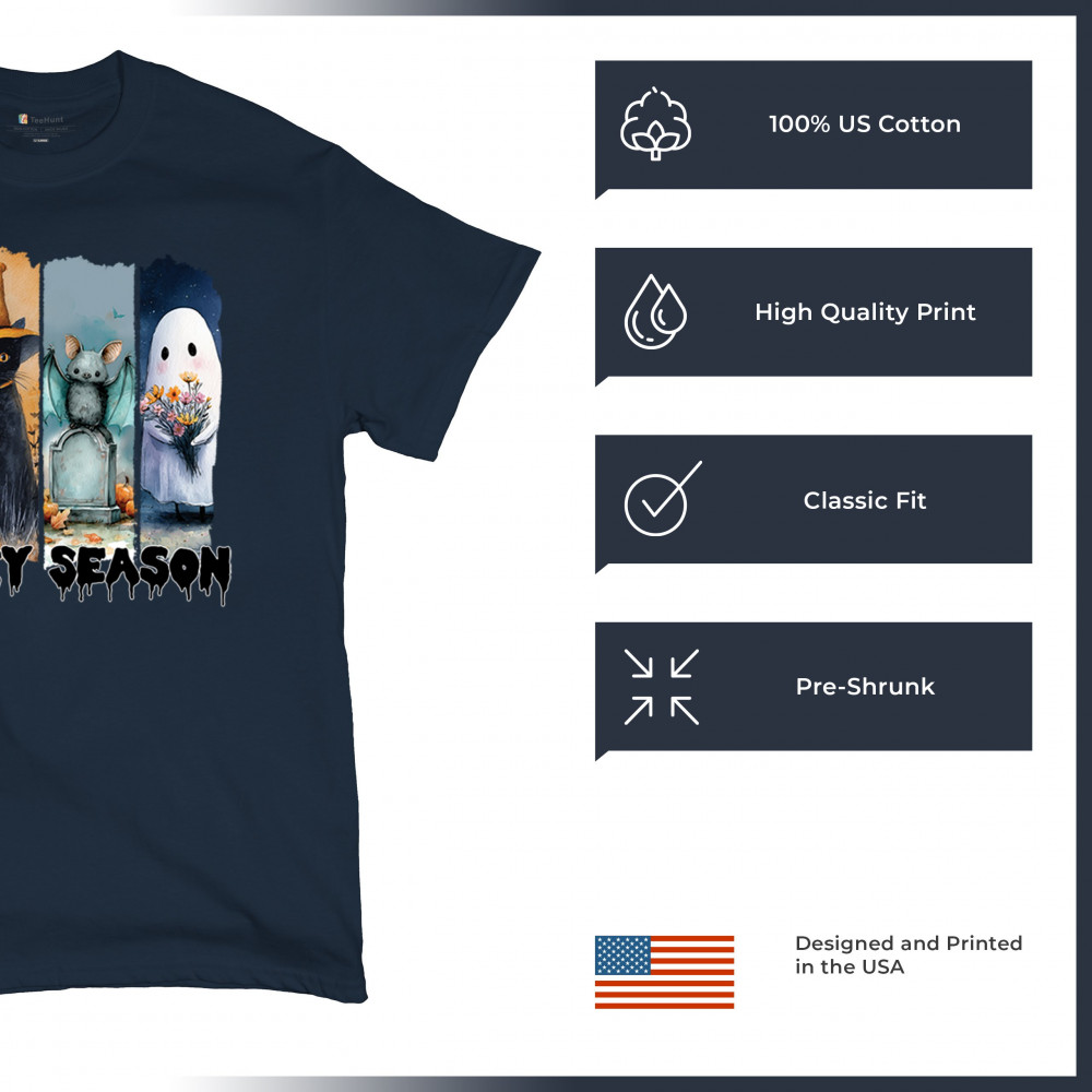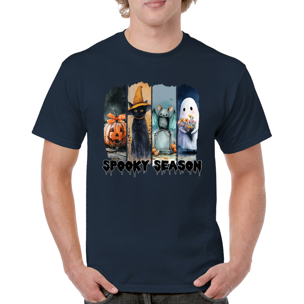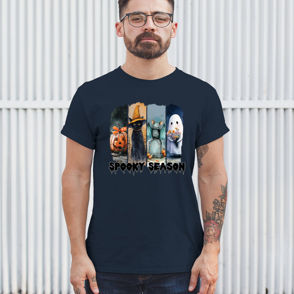Spooky Season design with scary black cat, jack o lantern, haunted ghost house, and cute ghost. Perfect for October 31, trick or treat, and fall fun.
