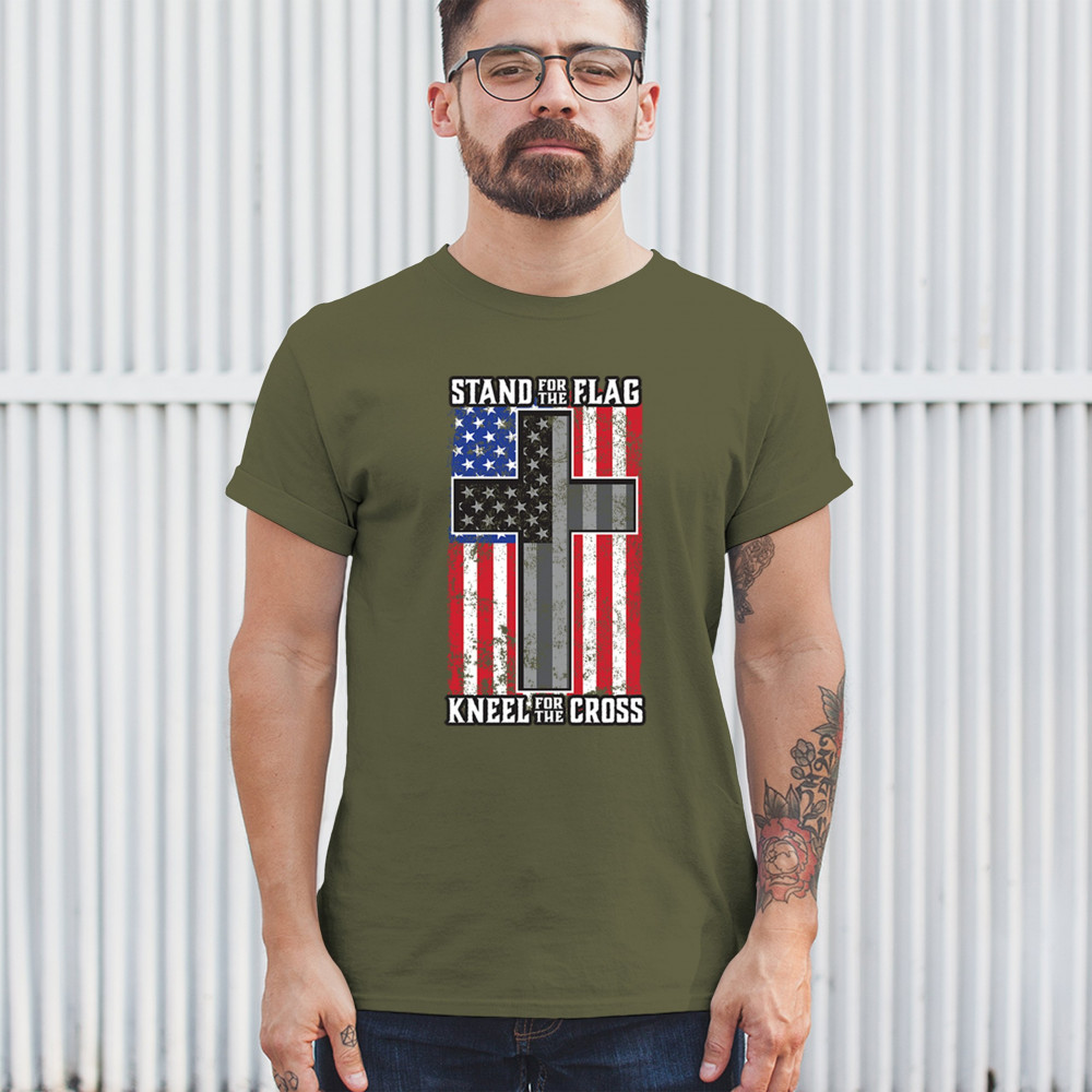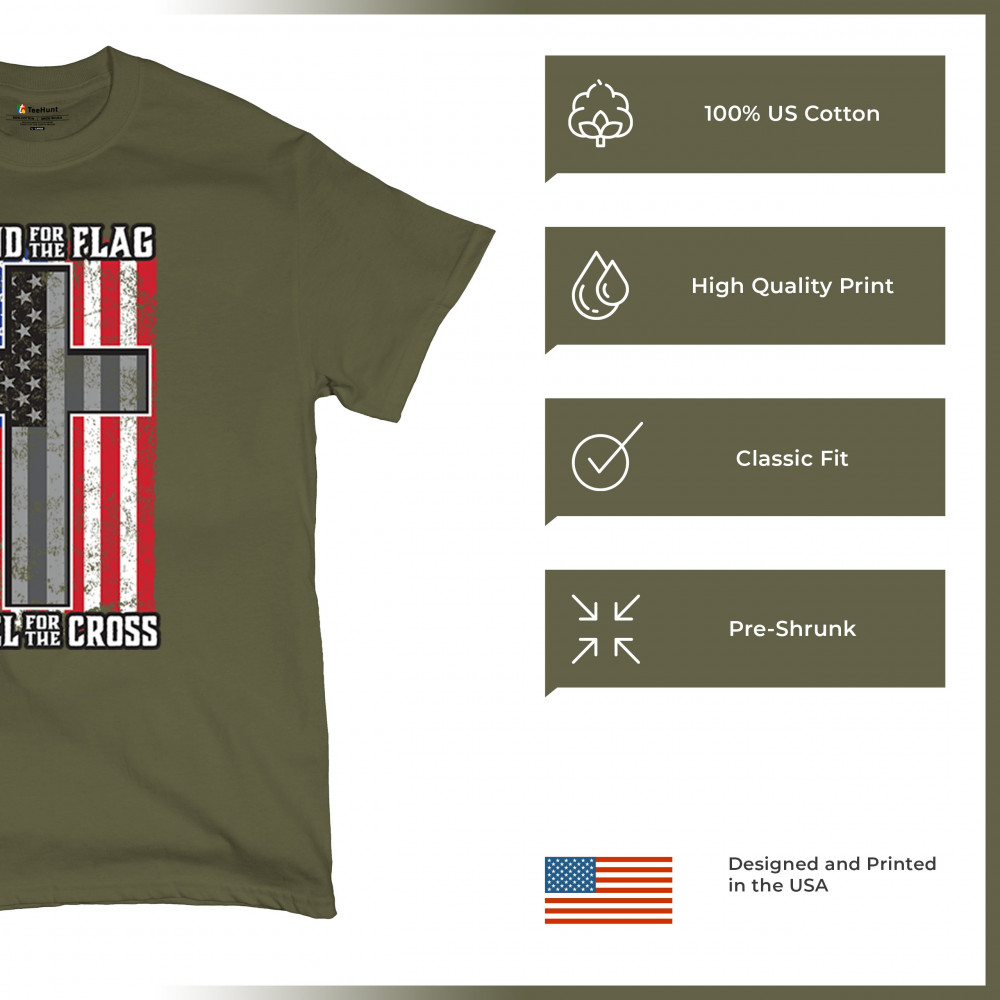 Embrace your identity as an American patriot and devout Christian with our Stand for the Flag Kneel for the Cross tee, a powerful testament to your values. Crafted with the American flag and the sacred cross, this design serves as both Trump merchandise and a symbol of unwavering faith. Whether you're a veteran, active military member, or simply a defender of liberty, this shirt proudly upholds the principles of the Second Amendment while honoring the legacy of Jesus Christ.