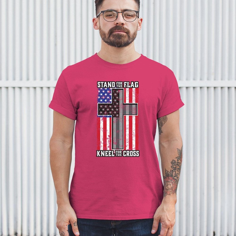 Embrace your identity as an American patriot and devout Christian with our Stand for the Flag Kneel for the Cross tee, a powerful testament to your values. Crafted with the American flag and the sacred cross, this design serves as both Trump merchandise and a symbol of unwavering faith. Whether you're a veteran, active military member, or simply a defender of liberty, this shirt proudly upholds the principles of the Second Amendment while honoring the legacy of Jesus Christ.