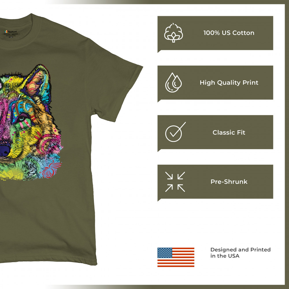 STARE OF THE WOLF t-shirt dean russo colorful neon animal art men's tee military green