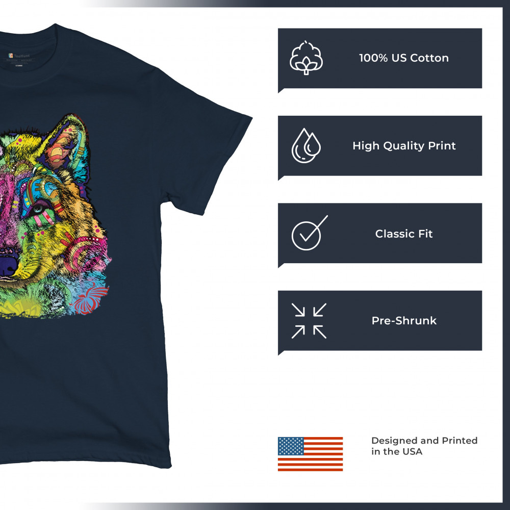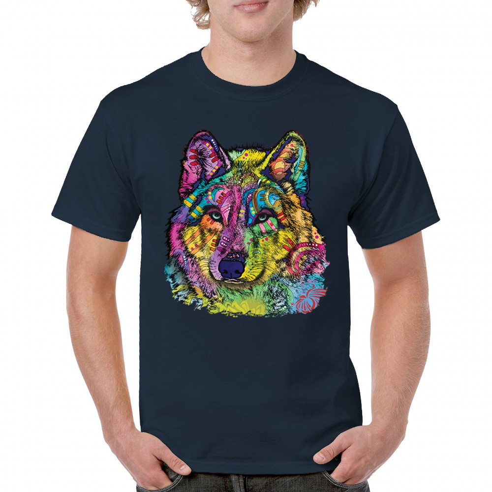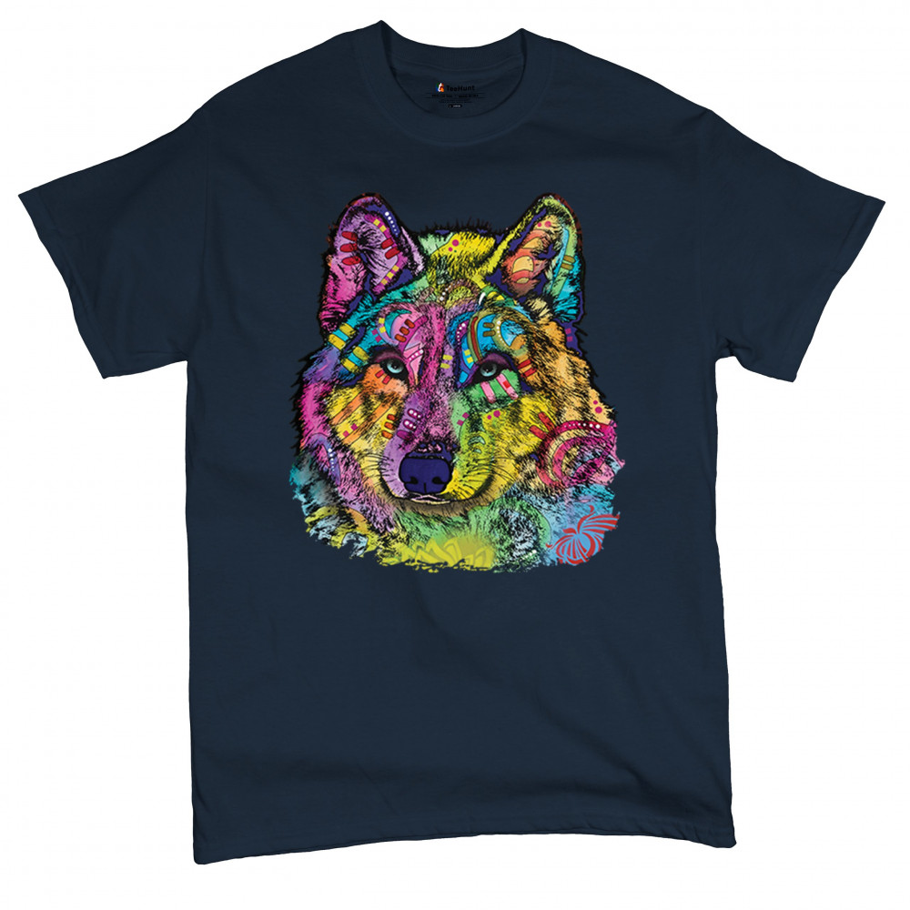 STARE OF THE WOLF t-shirt dean russo colorful neon animal art men's tee navy blue