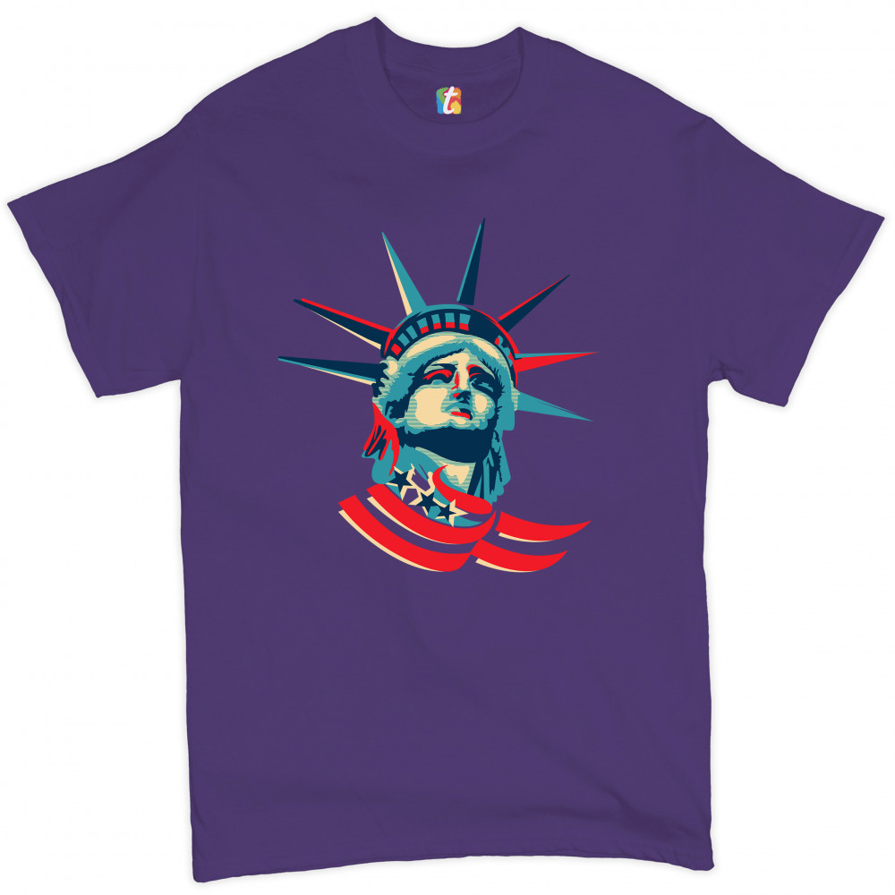A patriotic print featuring a dripping silhouette of a bald eagle. The body is painted blue with lots of stars on it and the feathers of the wings, painted red, resemble the stripes of the American Flag. Over the wings there is a text written: "Land of the free home of the brave". Great choice to wear on Independence Day or any other patriotic holiday.