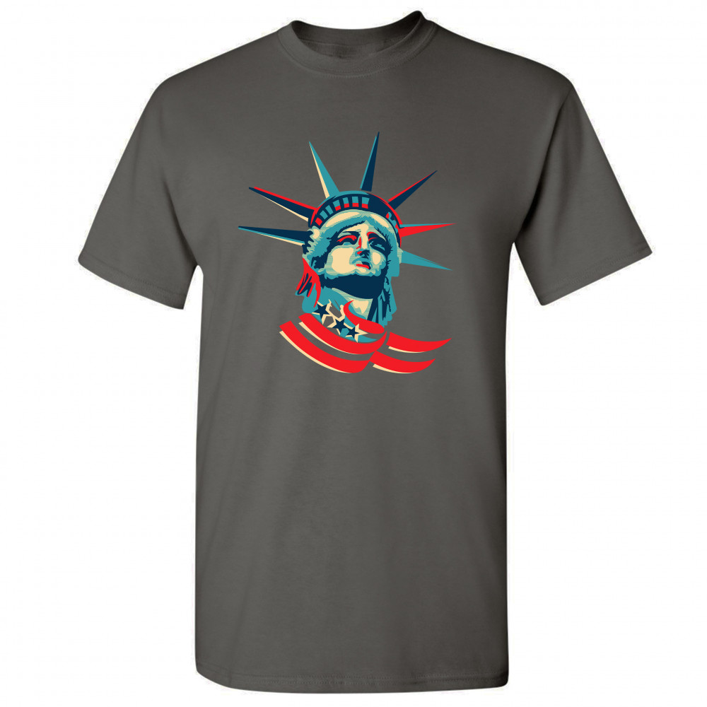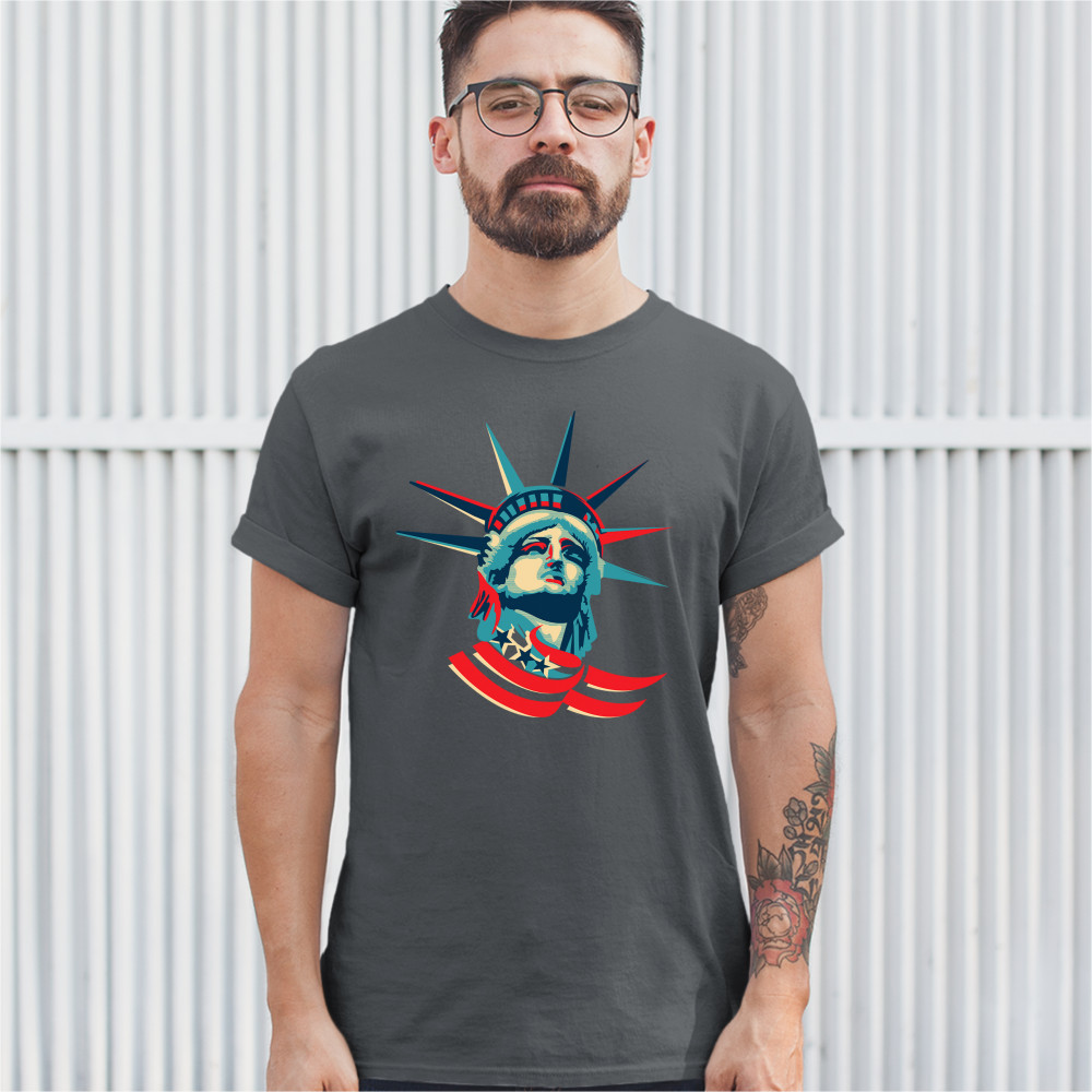A patriotic print featuring a dripping silhouette of a bald eagle. The body is painted blue with lots of stars on it and the feathers of the wings, painted red, resemble the stripes of the American Flag. Over the wings there is a text written: "Land of the free home of the brave". Great choice to wear on Independence Day or any other patriotic holiday.