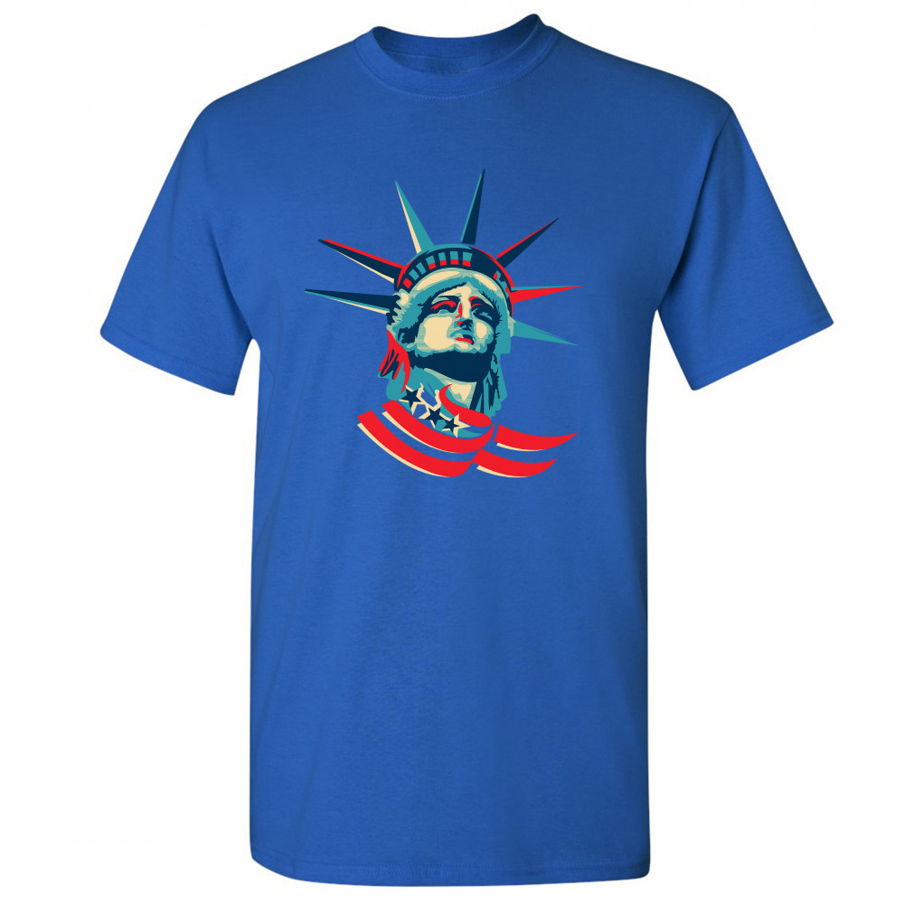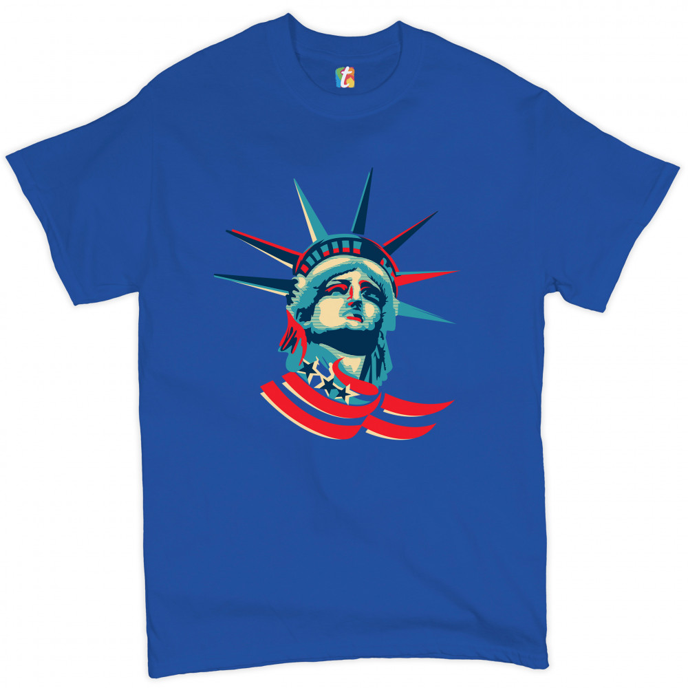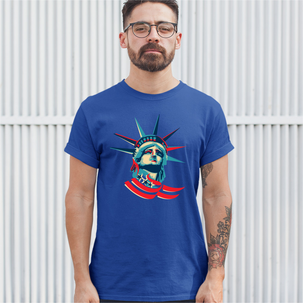 A patriotic print featuring a dripping silhouette of a bald eagle. The body is painted blue with lots of stars on it and the feathers of the wings, painted red, resemble the stripes of the American Flag. Over the wings there is a text written: "Land of the free home of the brave". Great choice to wear on Independence Day or any other patriotic holiday.