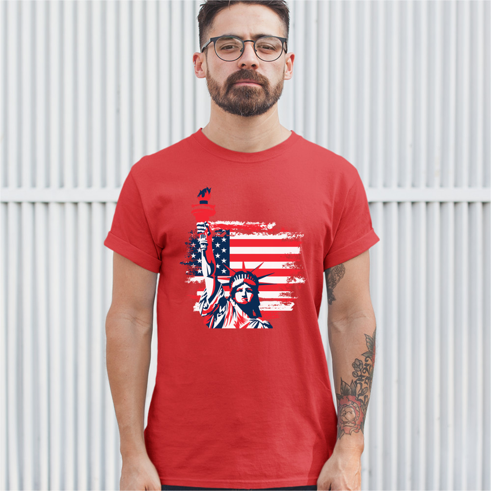 A patriotic print featuring a dripping silhouette of a bald eagle. The body is painted blue with lots of stars on it and the feathers of the wings, painted red, resemble the stripes of the American Flag. Over the wings there is a text written: "Land of the free home of the brave". Great choice to wear on Independence Day or any other patriotic holiday.