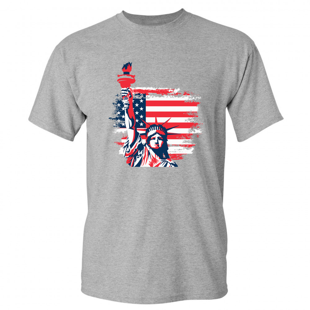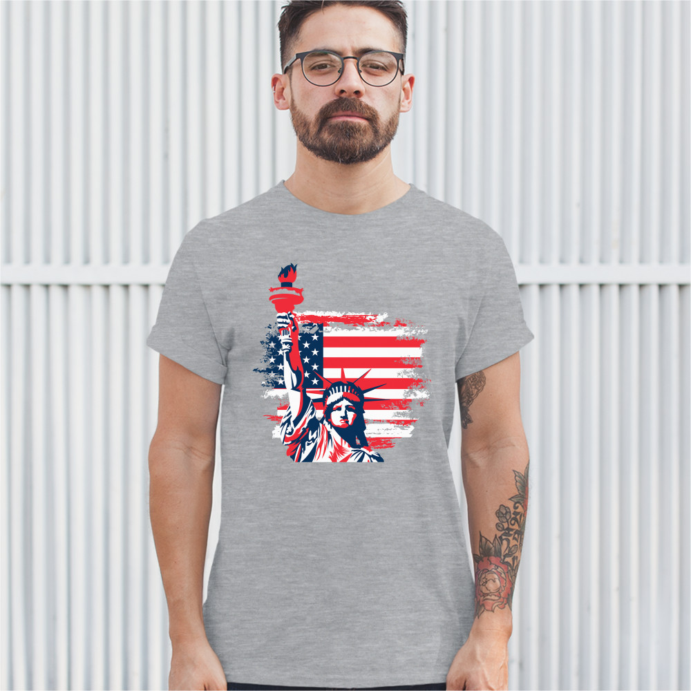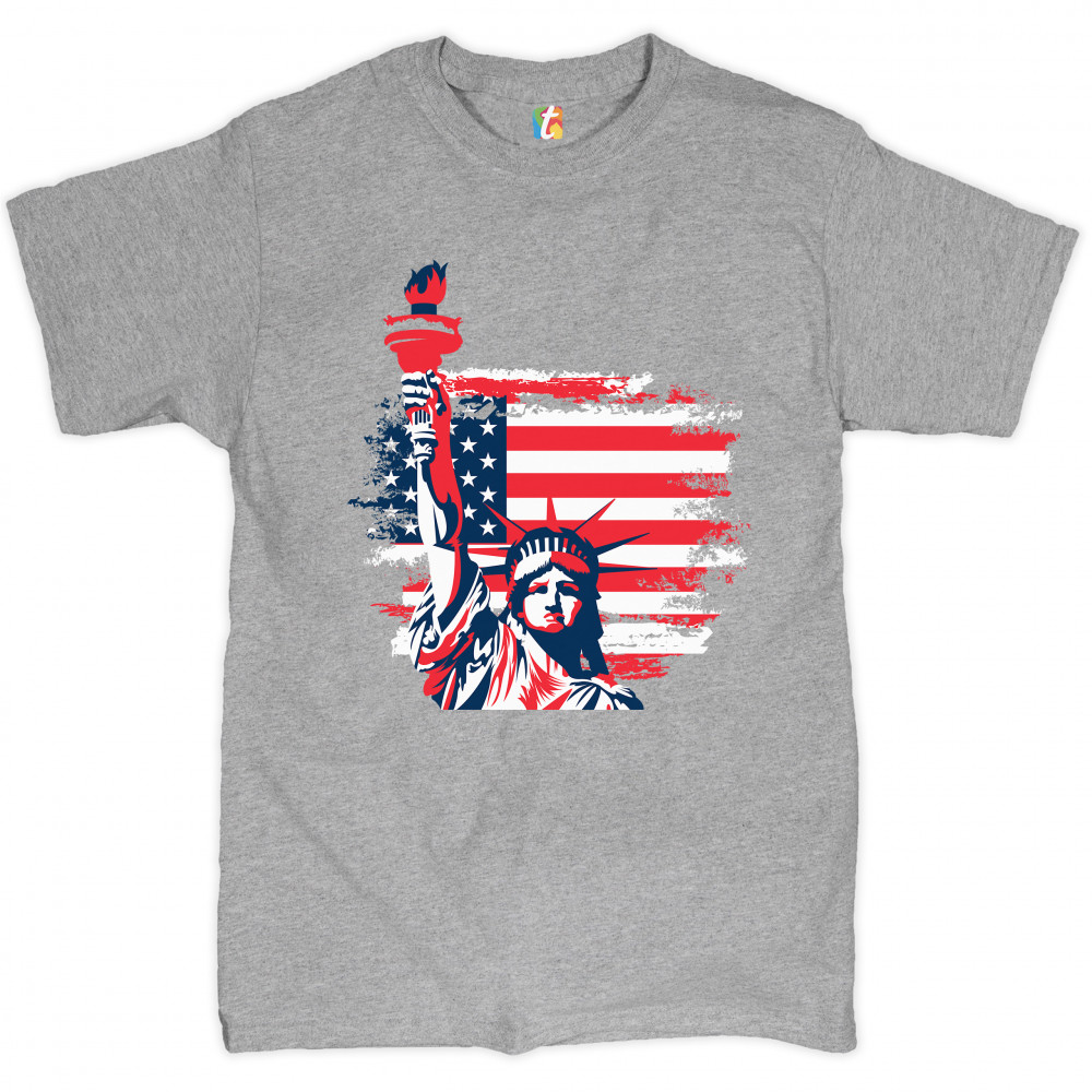 A patriotic print featuring a dripping silhouette of a bald eagle. The body is painted blue with lots of stars on it and the feathers of the wings, painted red, resemble the stripes of the American Flag. Over the wings there is a text written: "Land of the free home of the brave". Great choice to wear on Independence Day or any other patriotic holiday.