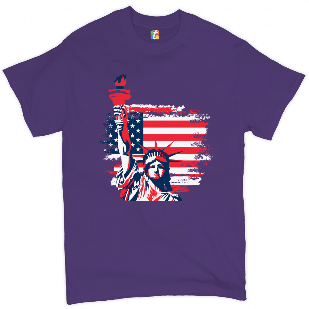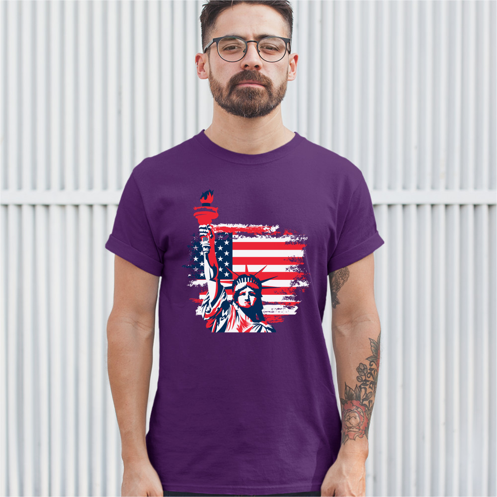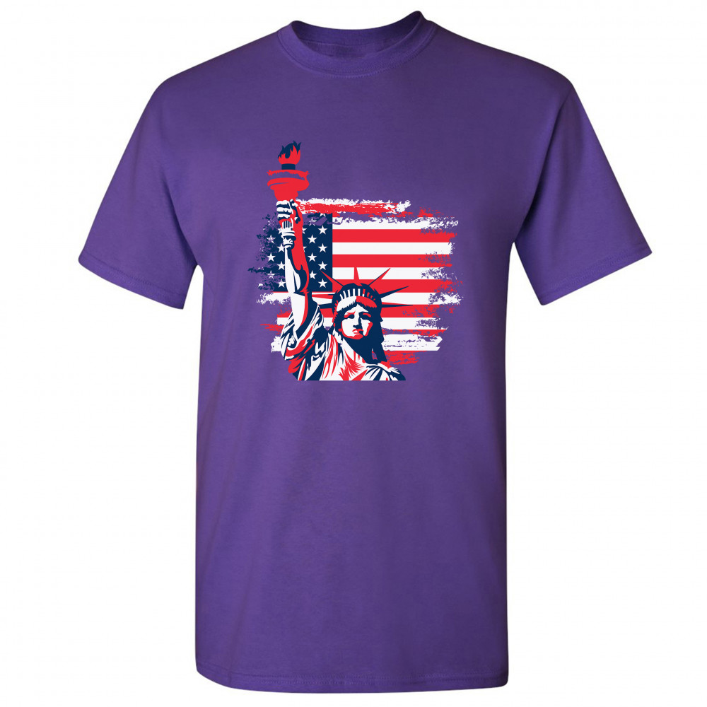 A patriotic print featuring a dripping silhouette of a bald eagle. The body is painted blue with lots of stars on it and the feathers of the wings, painted red, resemble the stripes of the American Flag. Over the wings there is a text written: "Land of the free home of the brave". Great choice to wear on Independence Day or any other patriotic holiday.