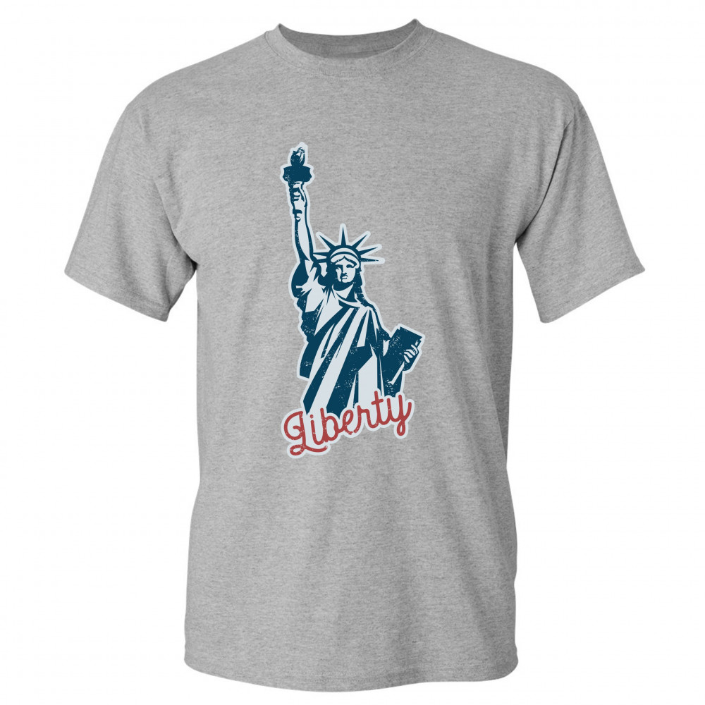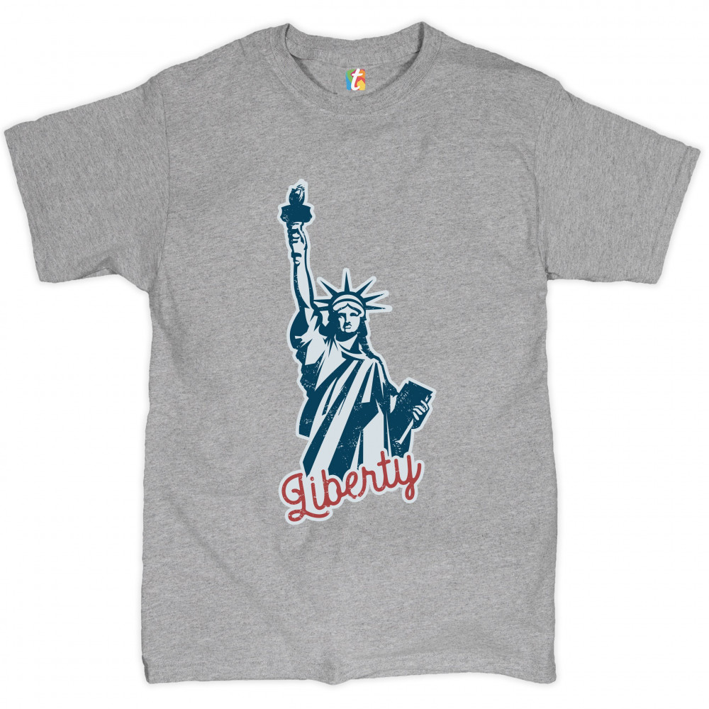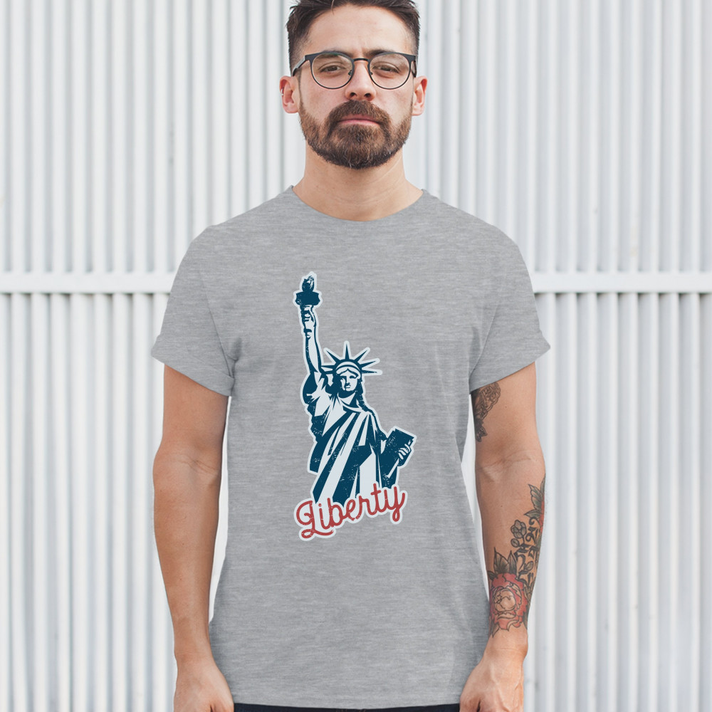 A patriotic print featuring the Statue of Liberty with the word "Liberty" written below it. Great choice to wear on Independence Day or any other patriotic holiday.