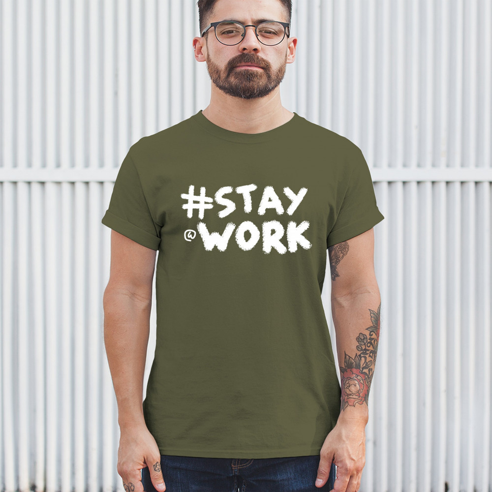 STAY AT WORK FUNNY ELON MUSK TWEET PARODY t-shirt liberal sarcasm men's tee military green