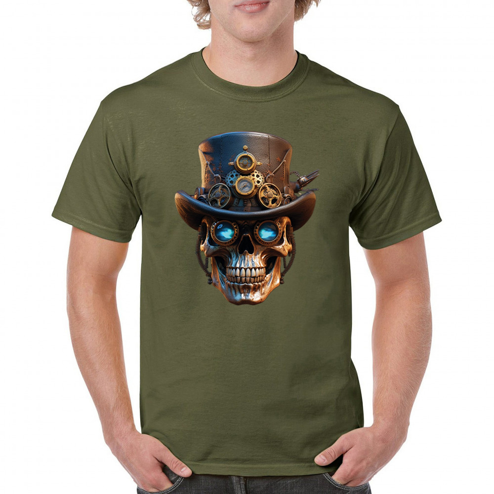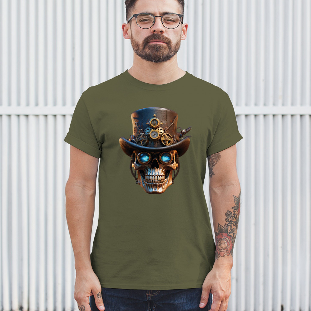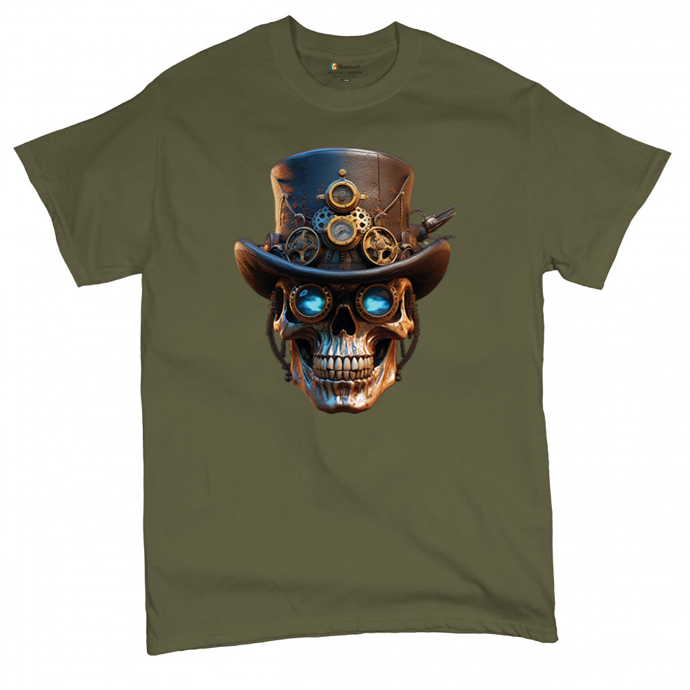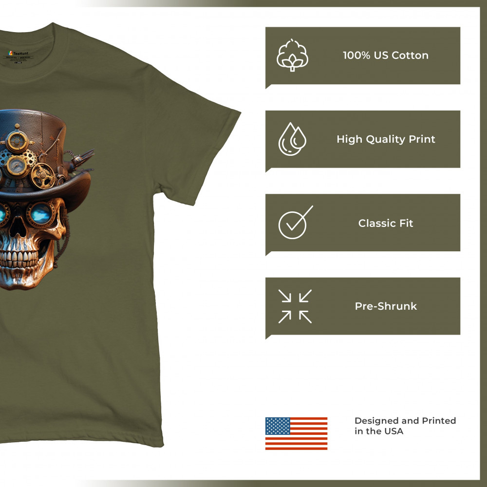 Steampunk skull shirt with gothic retro-futurism. Perfect for Halloween, cosplay, biker rallies, and edgy rebel fashion lovers.
