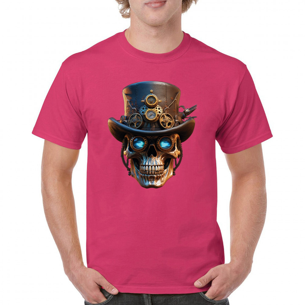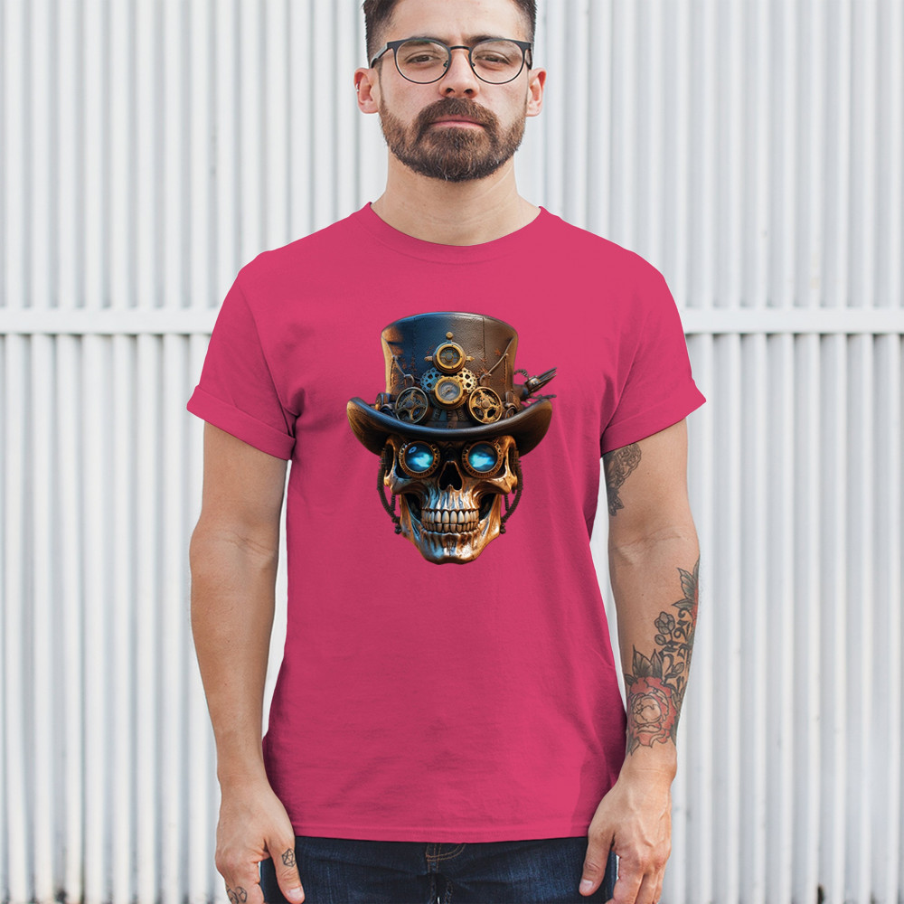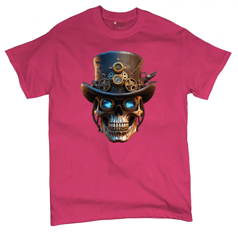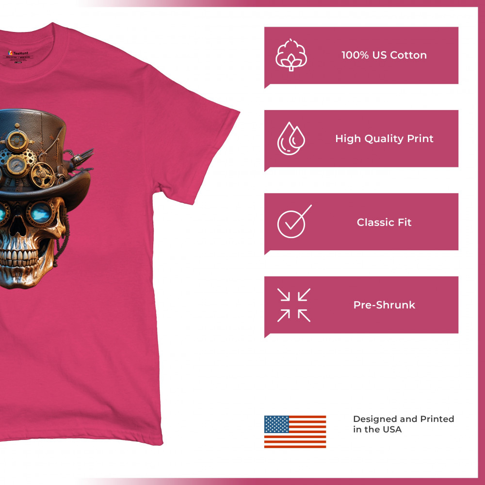 Steampunk skull shirt with gothic retro-futurism. Perfect for Halloween, cosplay, biker rallies, and edgy rebel fashion lovers.