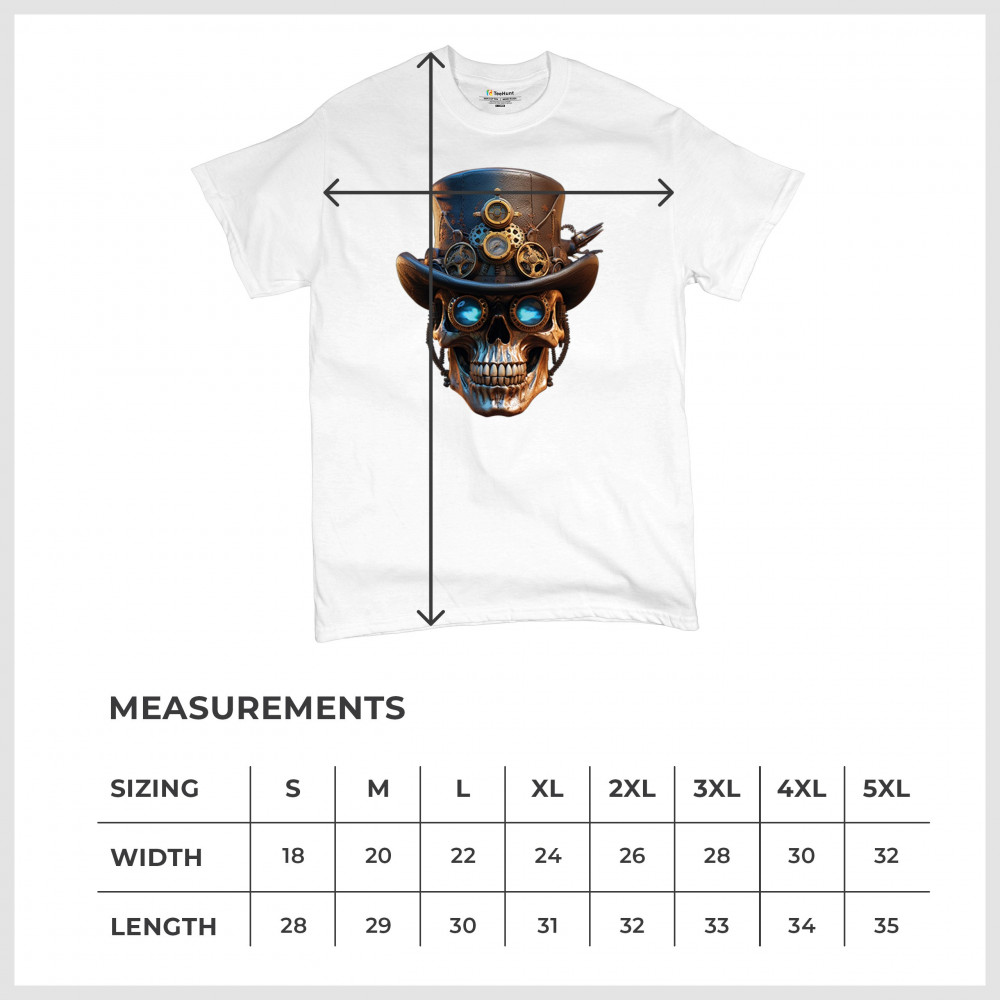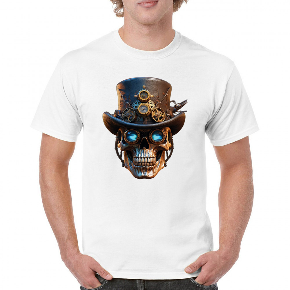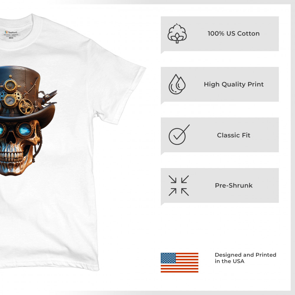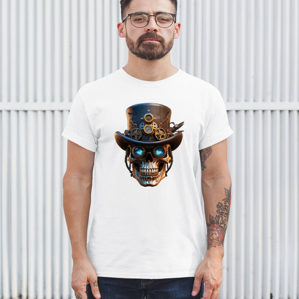 Steampunk skull shirt with gothic retro-futurism. Perfect for Halloween, cosplay, biker rallies, and edgy rebel fashion lovers.