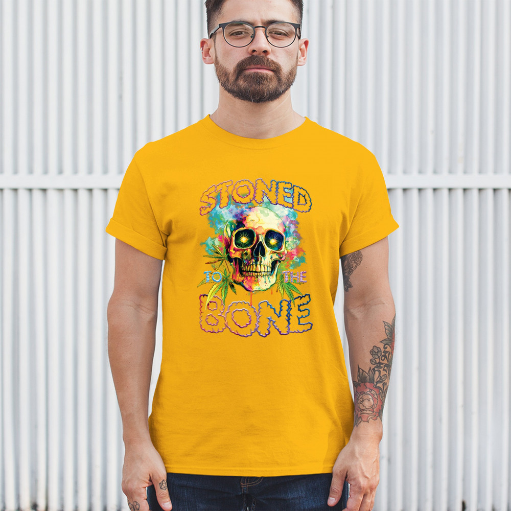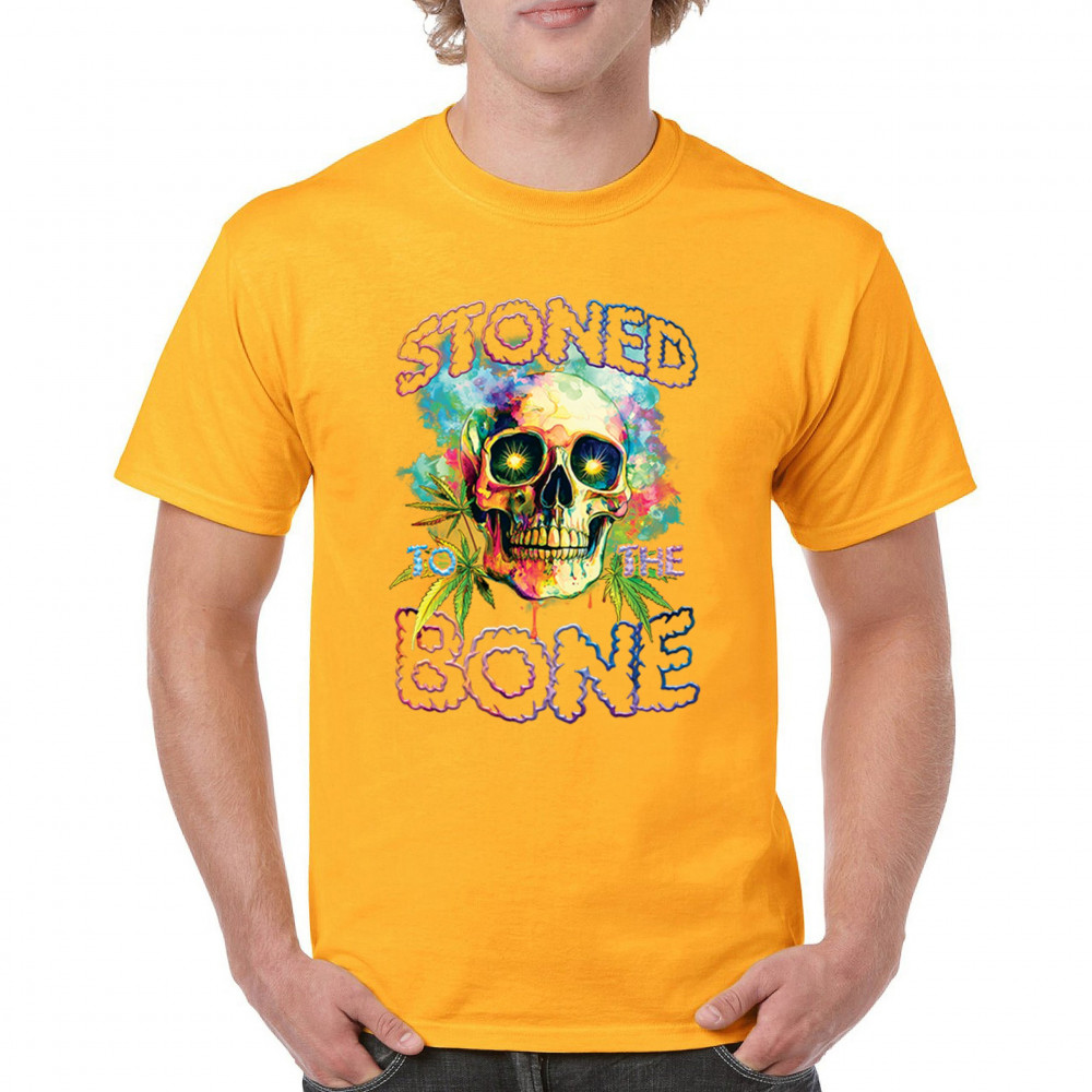 Turn heads with this bold, psychedelic “Stoned to the Bone†skull tee—loaded with neon colors, weed leaves, and a trippy aesthetic. It’s built for cannabis lovers, hippies, festival-goers, and party people living the high life. The ultimate head shop style and 420 fashion statement.