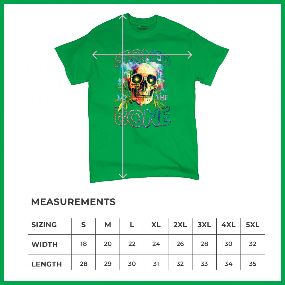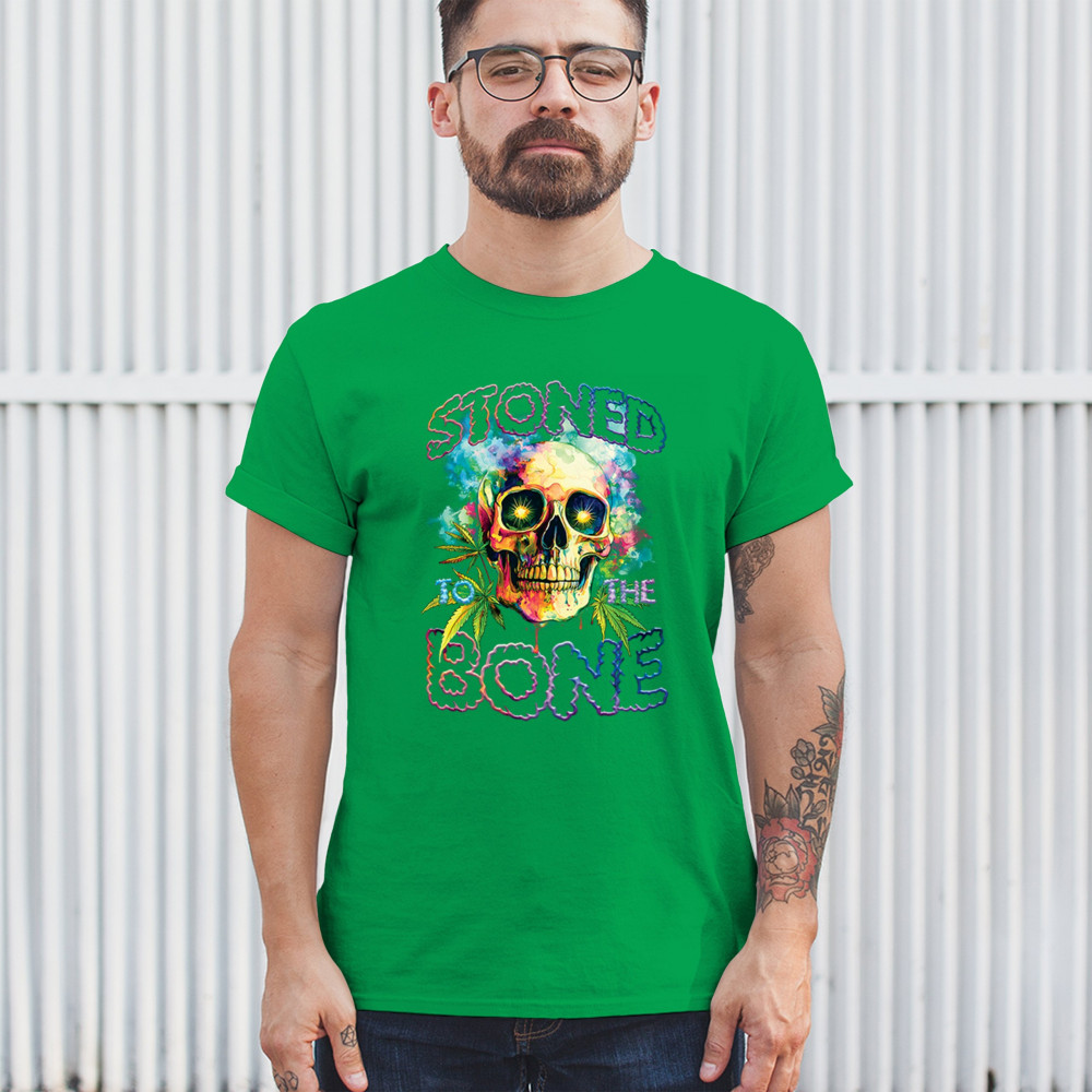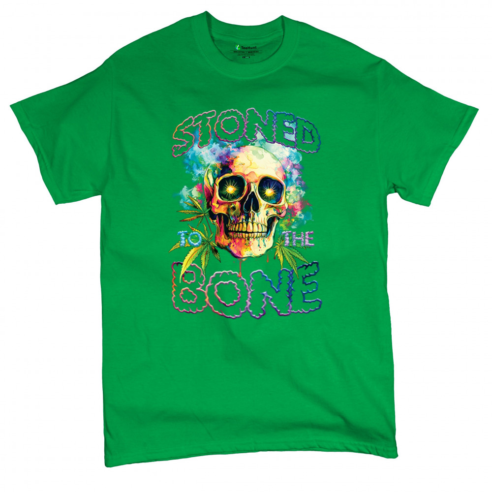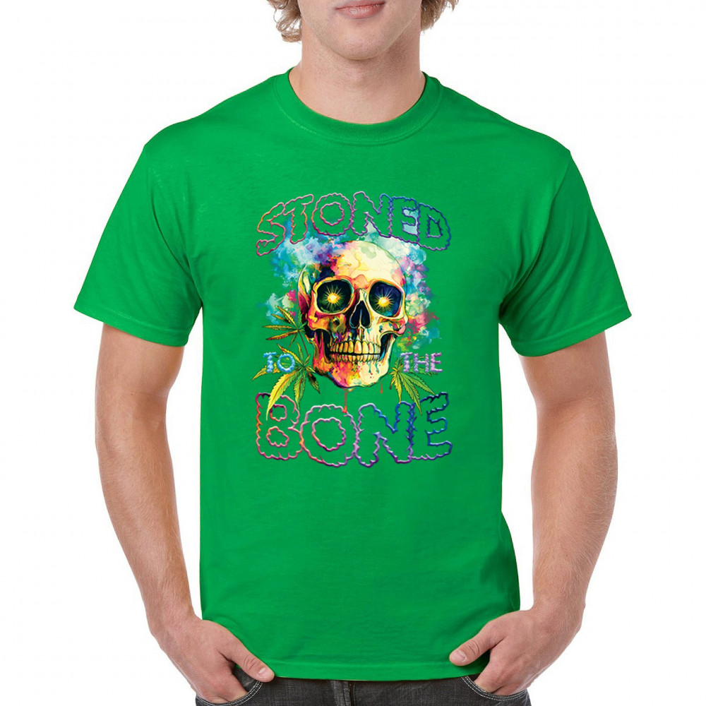 Turn heads with this bold, psychedelic “Stoned to the Bone†skull tee—loaded with neon colors, weed leaves, and a trippy aesthetic. It’s built for cannabis lovers, hippies, festival-goers, and party people living the high life. The ultimate head shop style and 420 fashion statement.