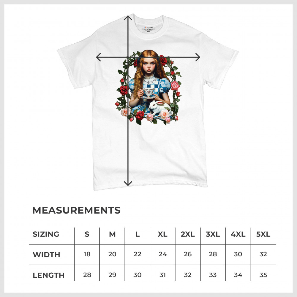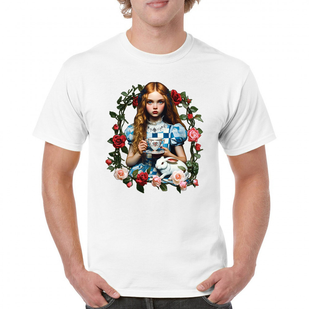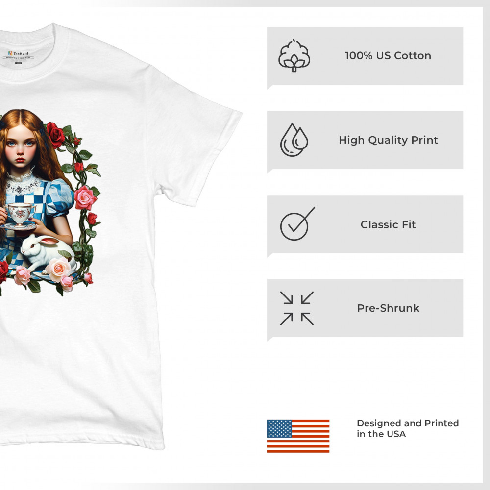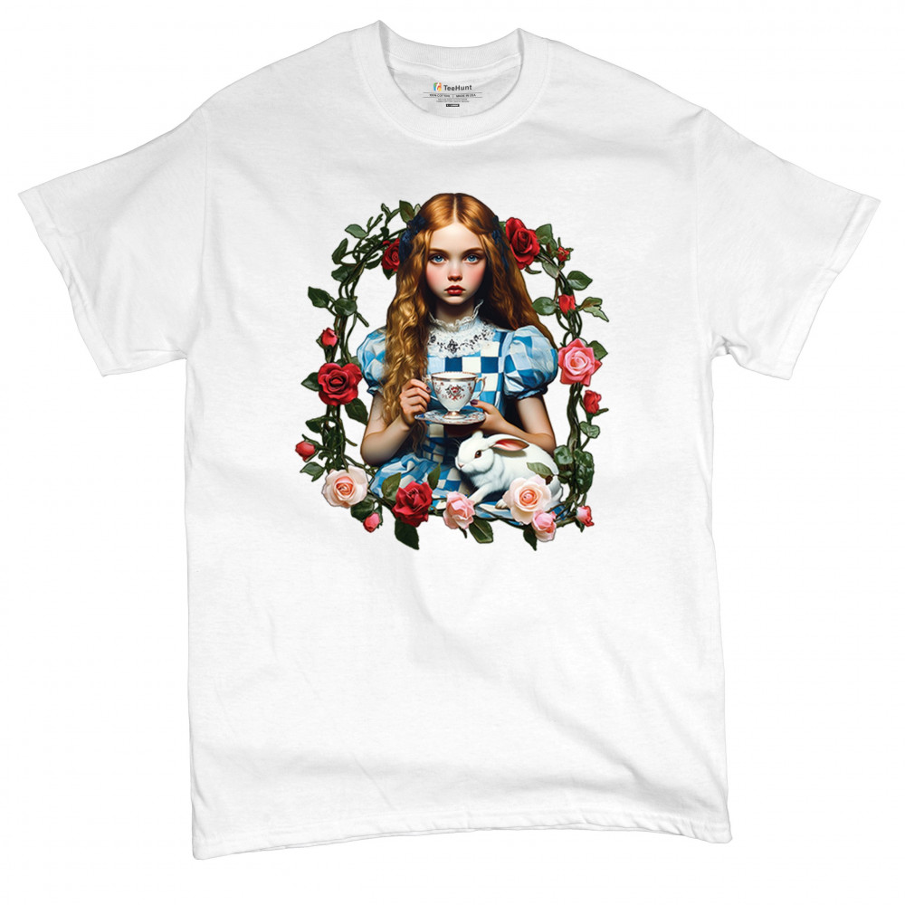 Step into a storybook dream with this Wonderland-inspired design featuring a young girl at a tea party with her white rabbit companion. Framed by roses, it evokes vintage charm, fantasy, and magical nostalgia. Ideal for bookworms, collectors, and lovers of fairytales, it blends whimsical elegance with timeless childhood wonder.