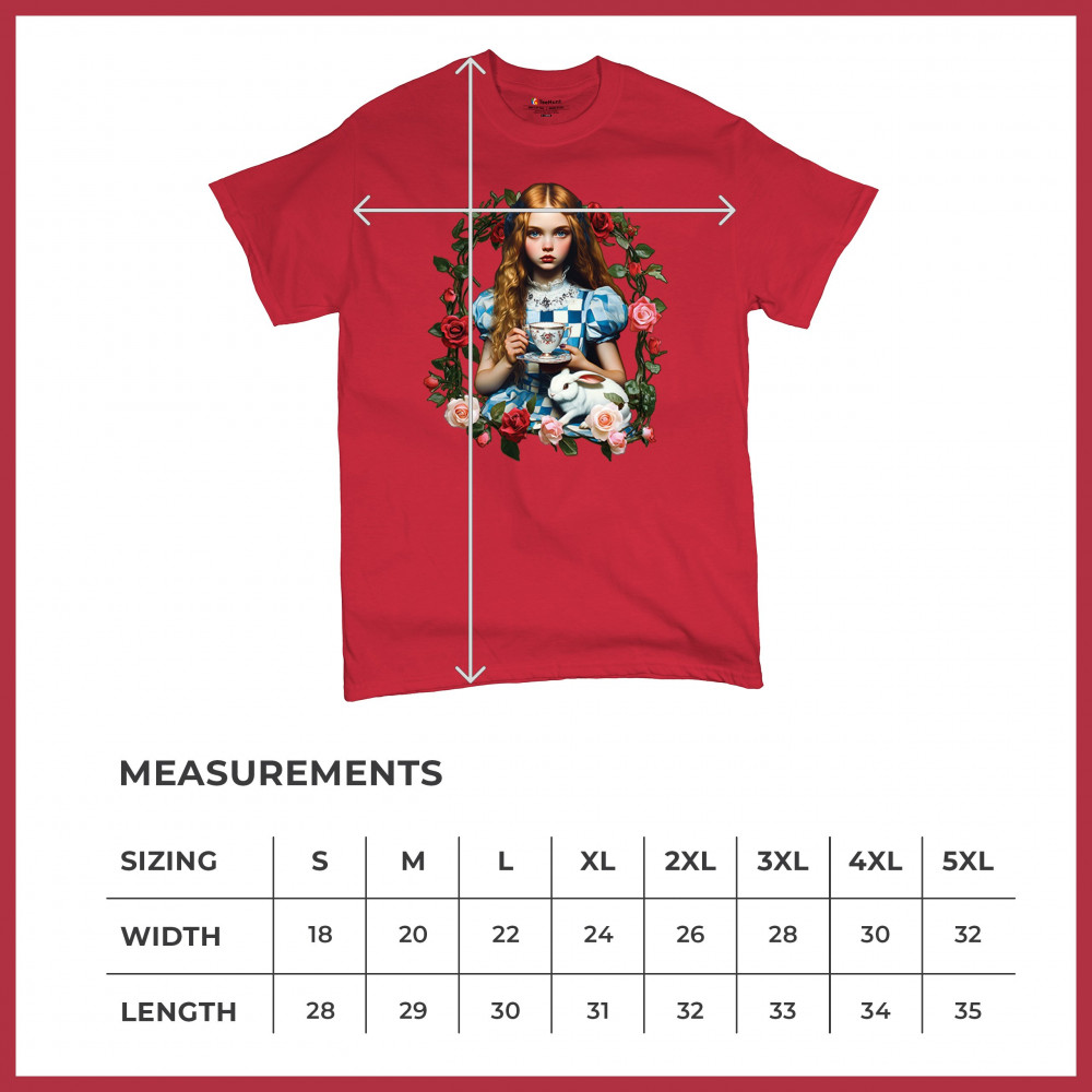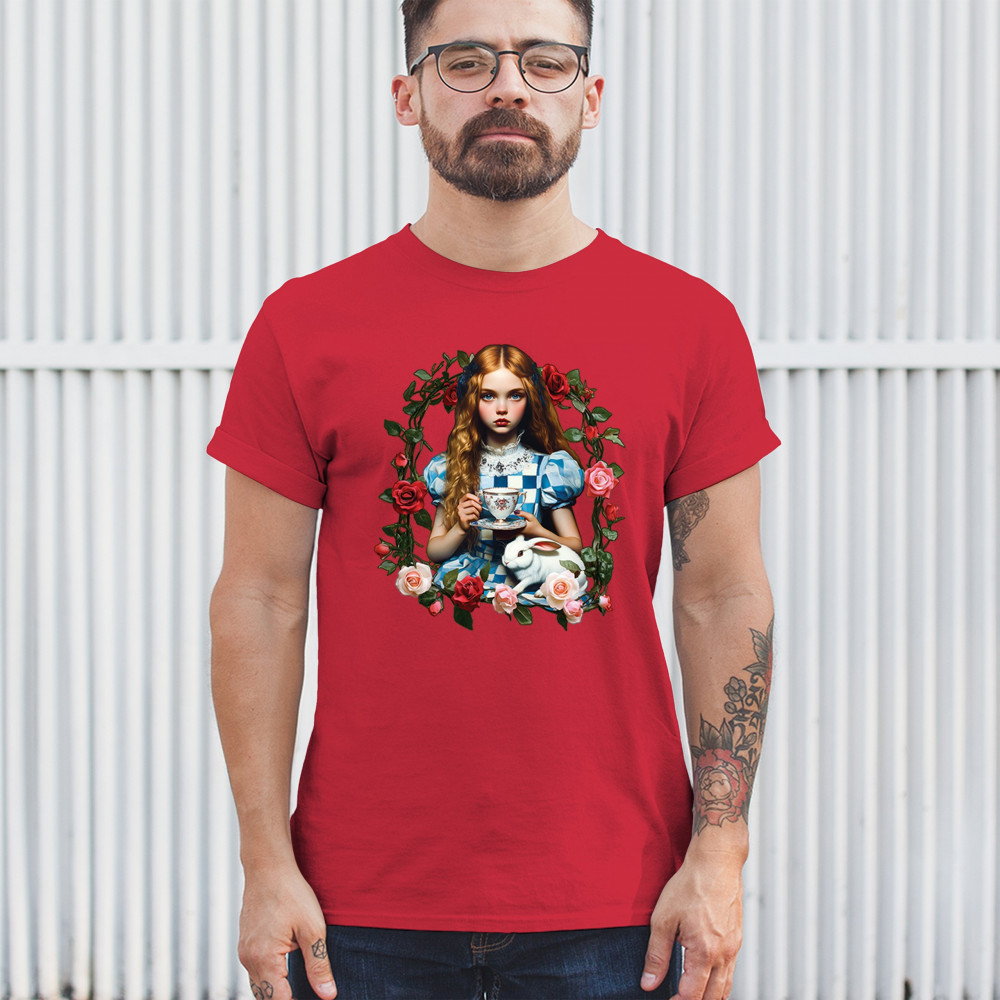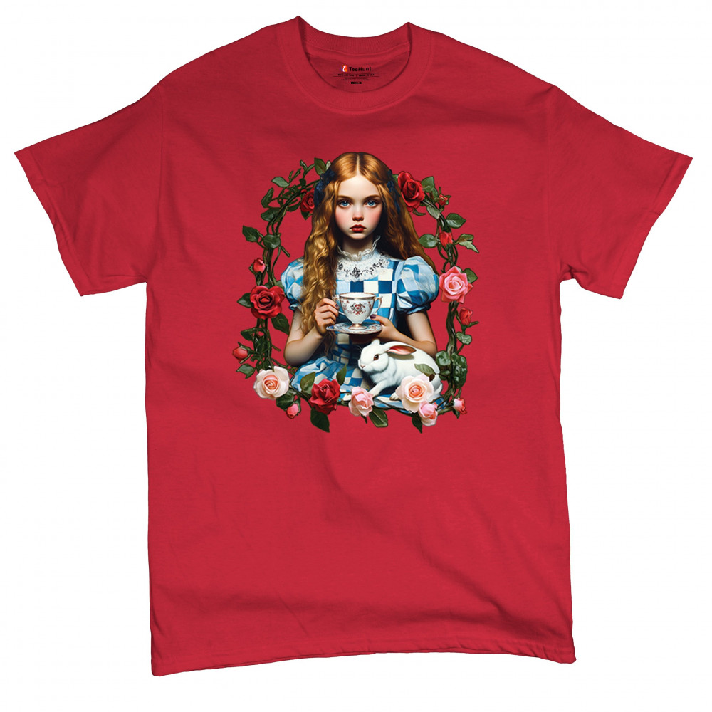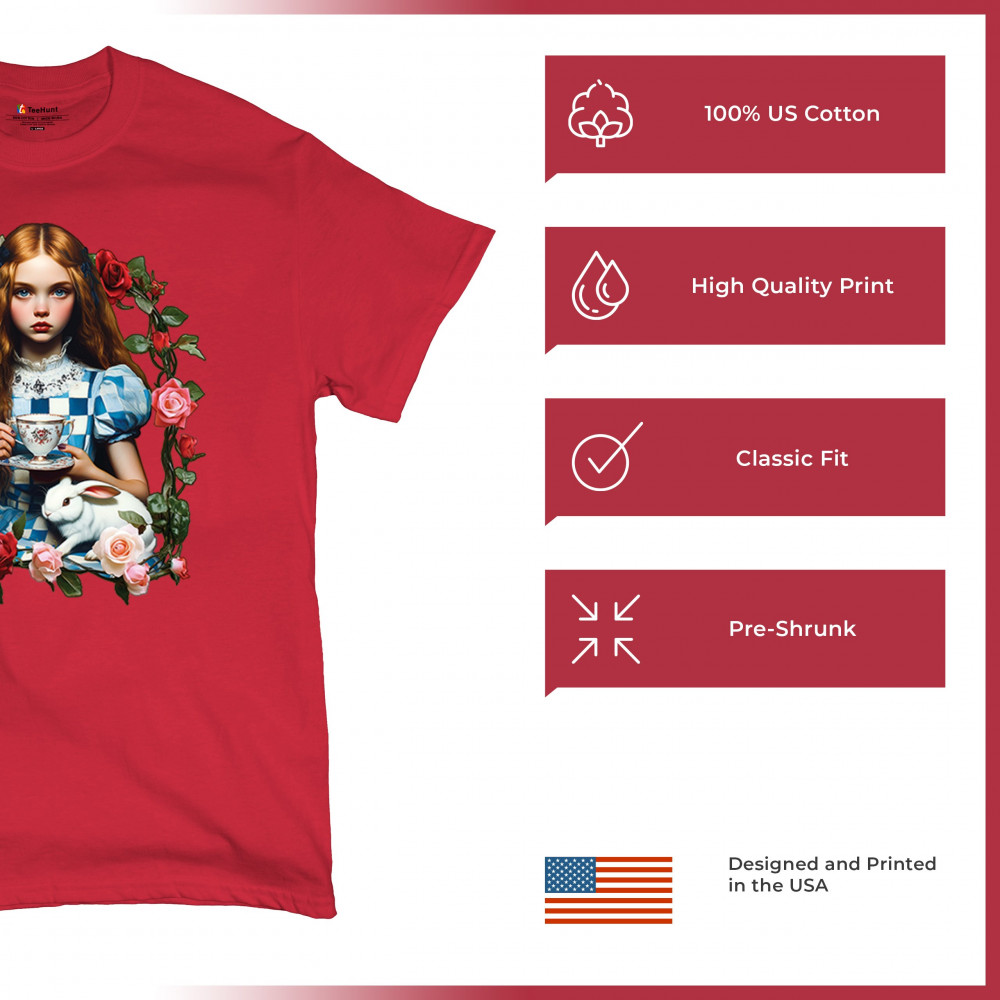 Step into a storybook dream with this Wonderland-inspired design featuring a young girl at a tea party with her white rabbit companion. Framed by roses, it evokes vintage charm, fantasy, and magical nostalgia. Ideal for bookworms, collectors, and lovers of fairytales, it blends whimsical elegance with timeless childhood wonder.
