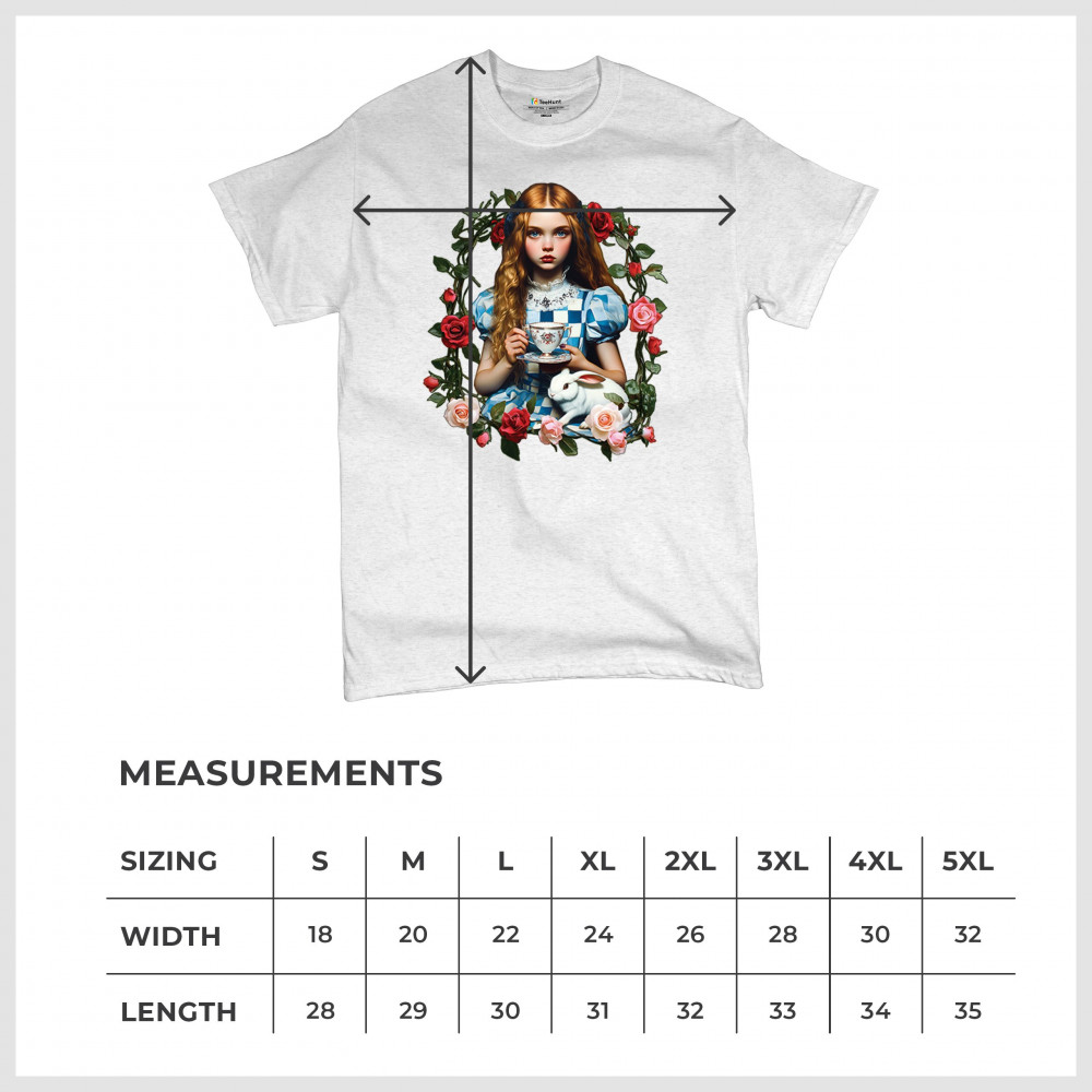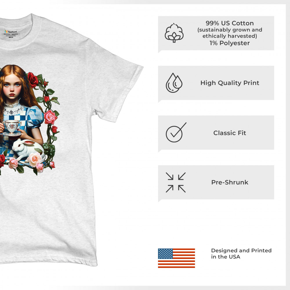 Step into a storybook dream with this Wonderland-inspired design featuring a young girl at a tea party with her white rabbit companion. Framed by roses, it evokes vintage charm, fantasy, and magical nostalgia. Ideal for bookworms, collectors, and lovers of fairytales, it blends whimsical elegance with timeless childhood wonder.