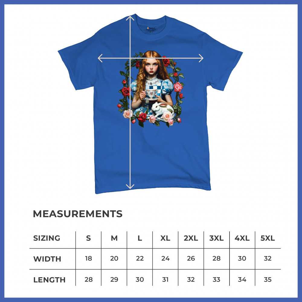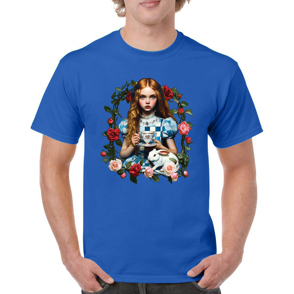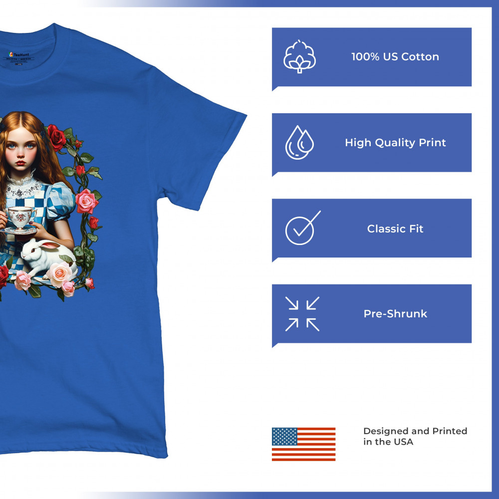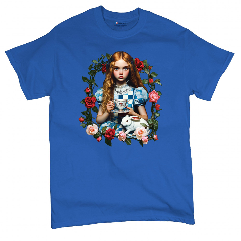 Step into a storybook dream with this Wonderland-inspired design featuring a young girl at a tea party with her white rabbit companion. Framed by roses, it evokes vintage charm, fantasy, and magical nostalgia. Ideal for bookworms, collectors, and lovers of fairytales, it blends whimsical elegance with timeless childhood wonder.