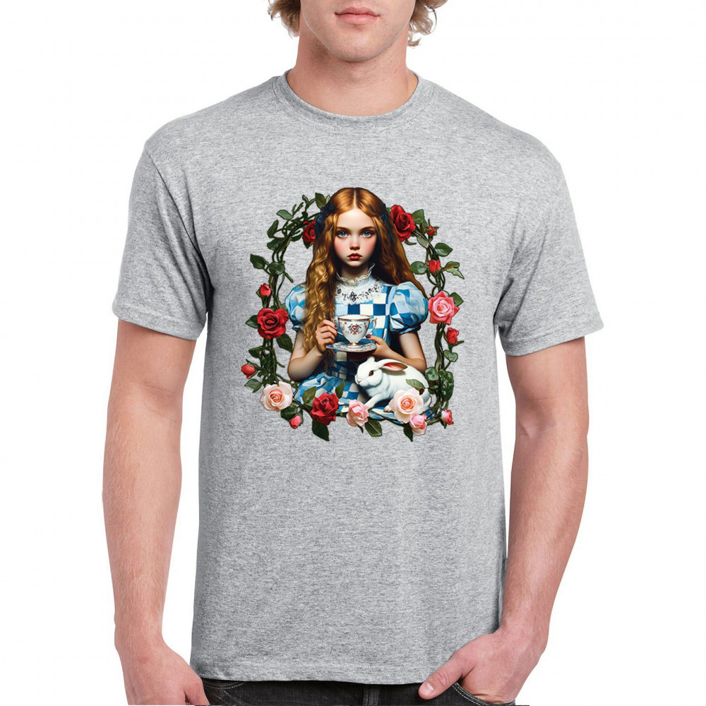 Step into a storybook dream with this Wonderland-inspired design featuring a young girl at a tea party with her white rabbit companion. Framed by roses, it evokes vintage charm, fantasy, and magical nostalgia. Ideal for bookworms, collectors, and lovers of fairytales, it blends whimsical elegance with timeless childhood wonder.