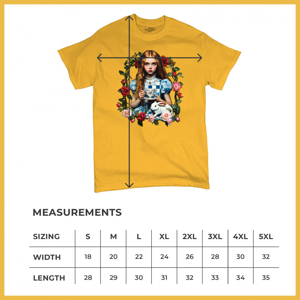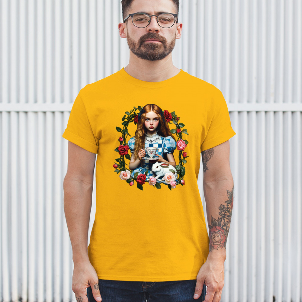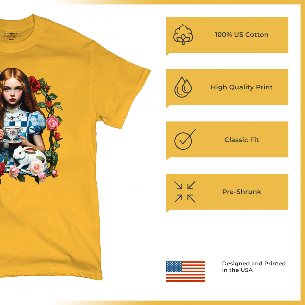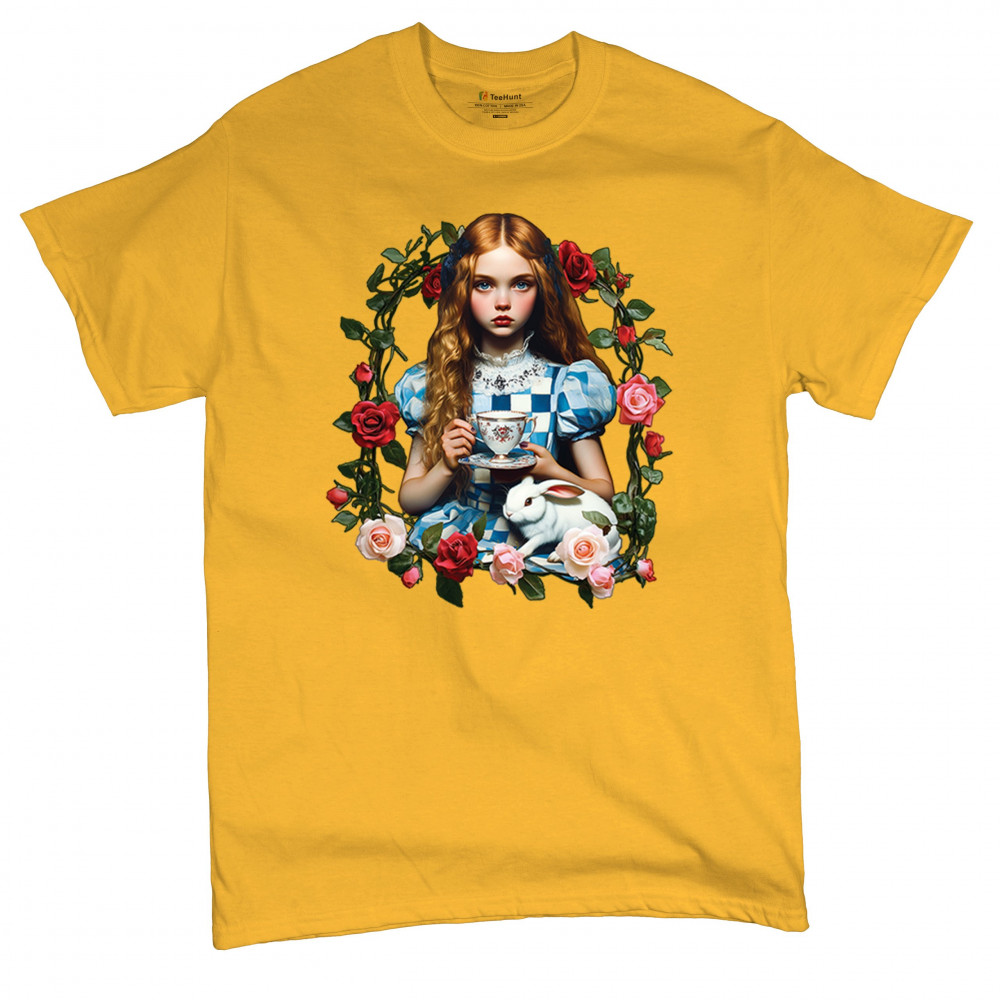 Step into a storybook dream with this Wonderland-inspired design featuring a young girl at a tea party with her white rabbit companion. Framed by roses, it evokes vintage charm, fantasy, and magical nostalgia. Ideal for bookworms, collectors, and lovers of fairytales, it blends whimsical elegance with timeless childhood wonder.