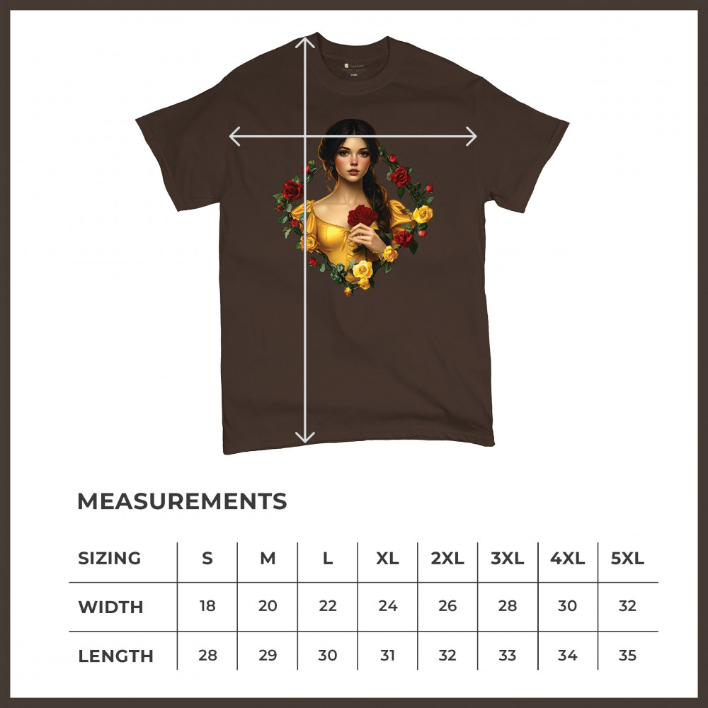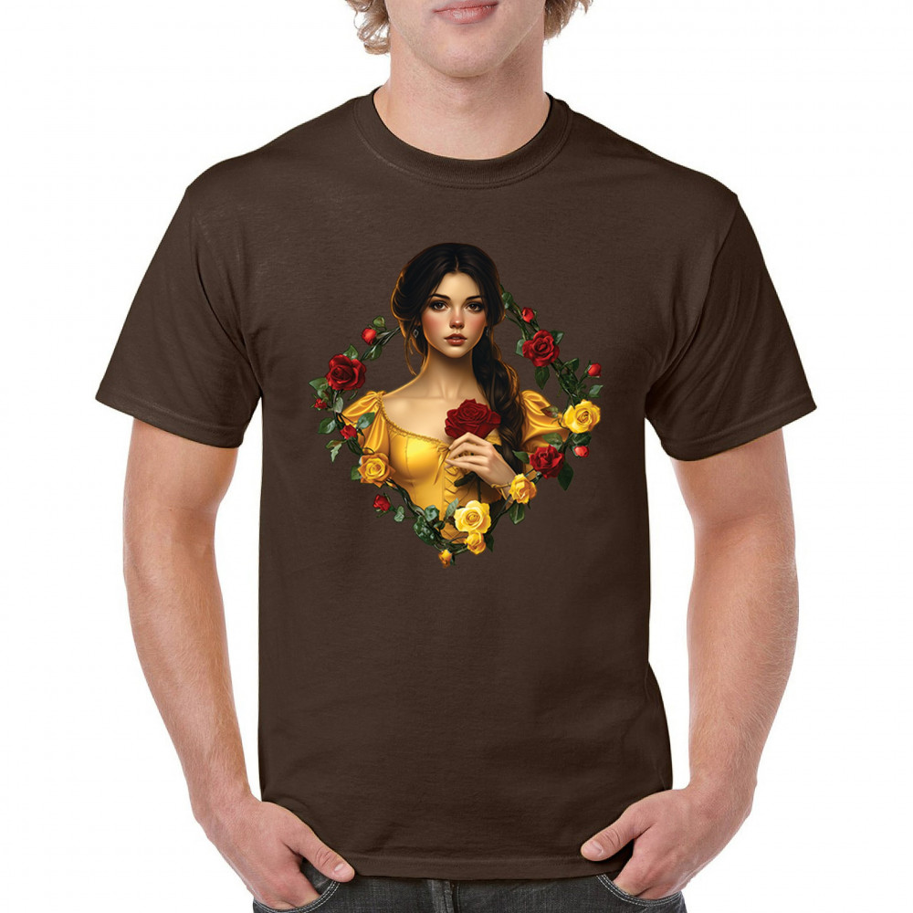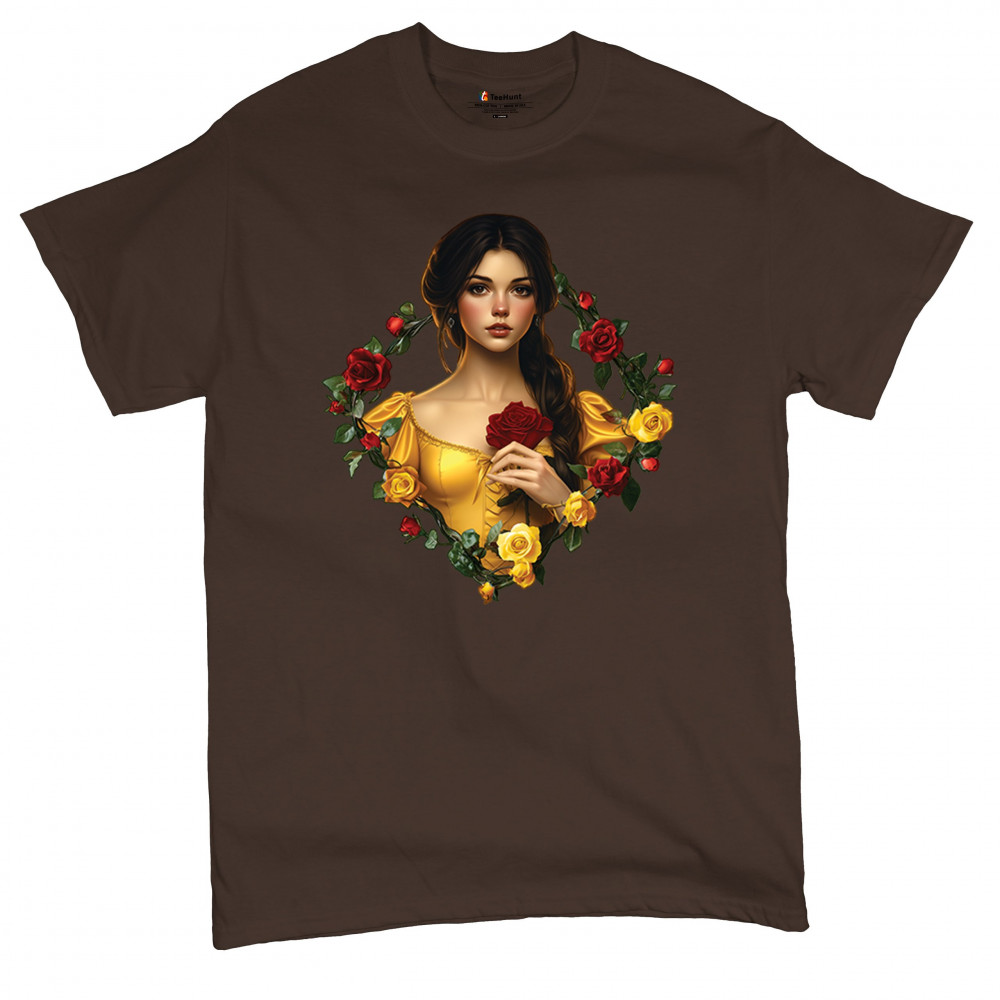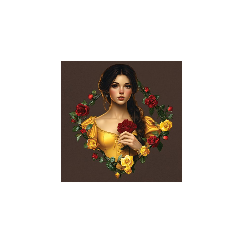 Inspired by classic fairytales, this design features a girl in a yellow gown holding a red rose, framed by rich red and yellow roses. A tribute to Beauty and the Beast, it radiates warmth, romance, and timeless fantasy. Perfect for storybook lovers, enchanted art collectors, or those drawn to magical, symbolic imagery filled with beauty and grace.