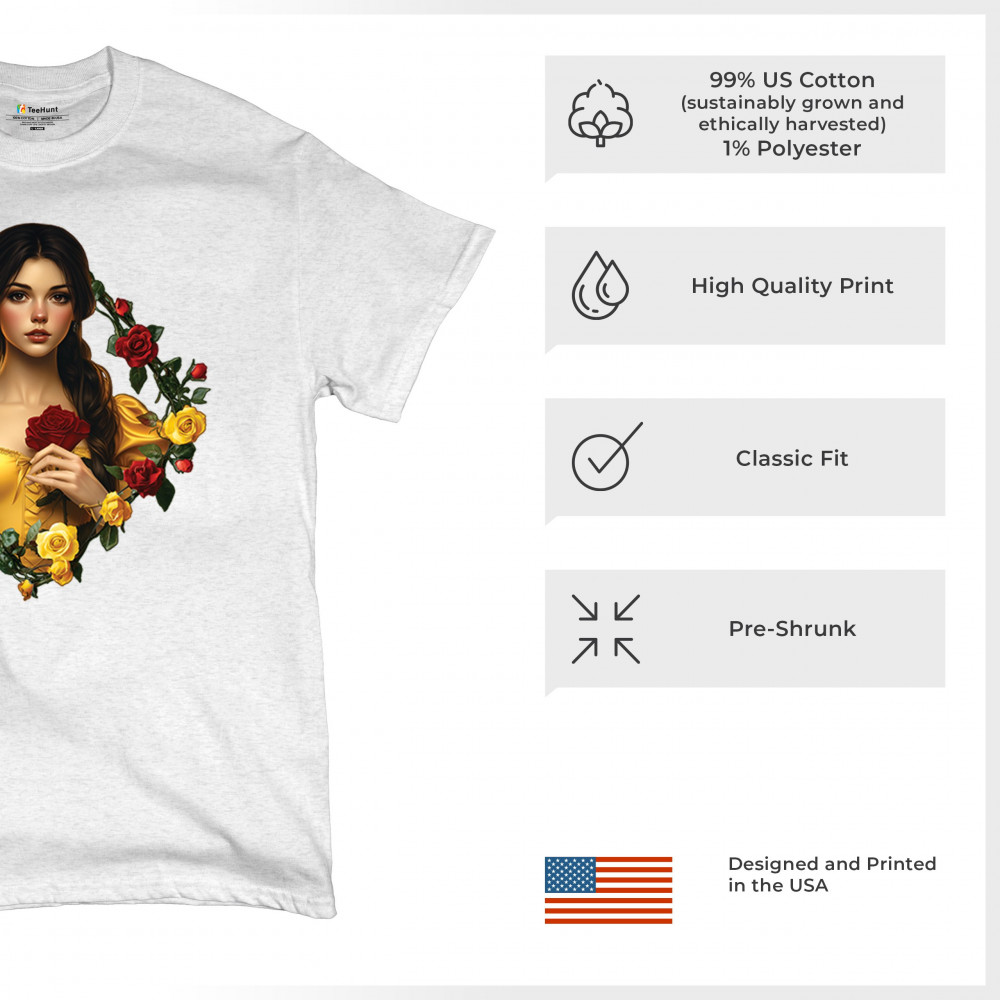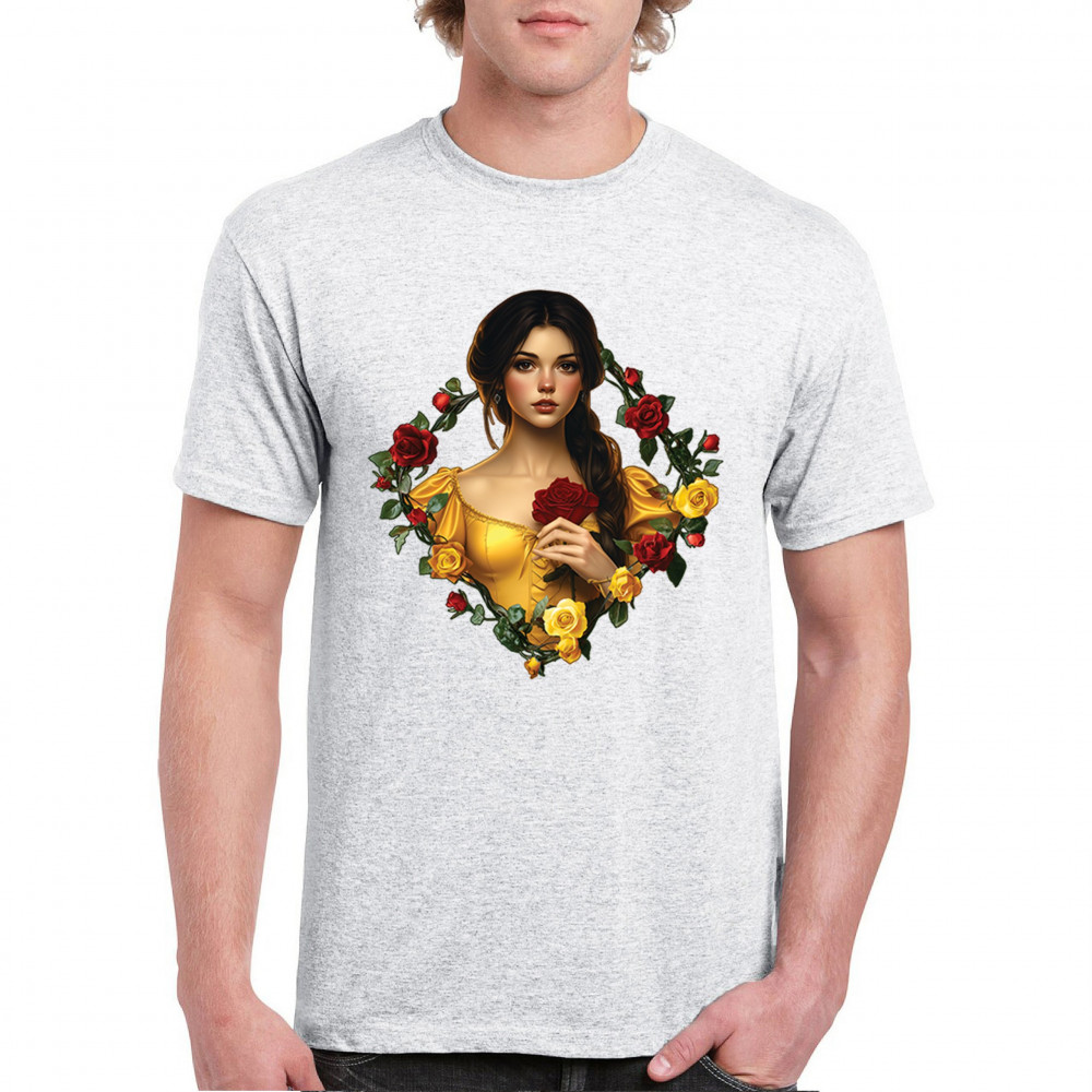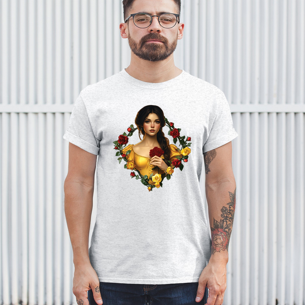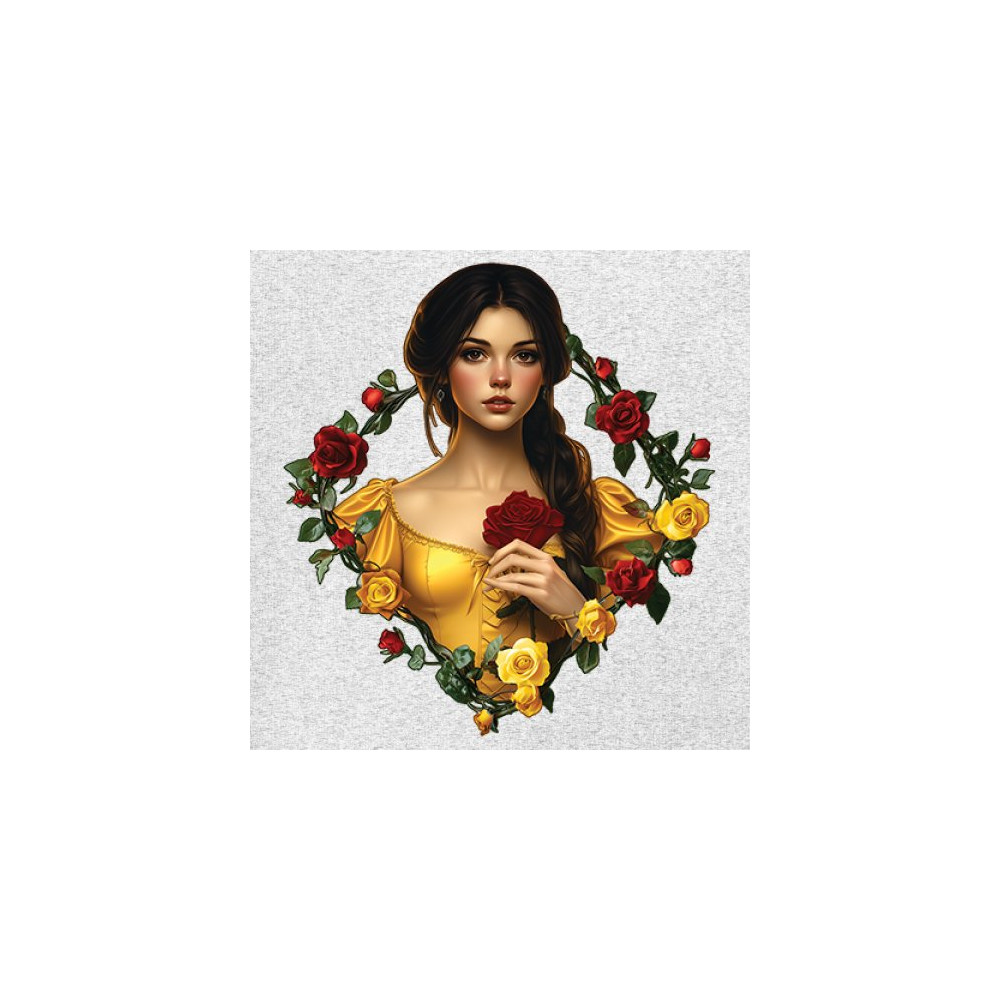 Inspired by classic fairytales, this design features a girl in a yellow gown holding a red rose, framed by rich red and yellow roses. A tribute to Beauty and the Beast, it radiates warmth, romance, and timeless fantasy. Perfect for storybook lovers, enchanted art collectors, or those drawn to magical, symbolic imagery filled with beauty and grace.