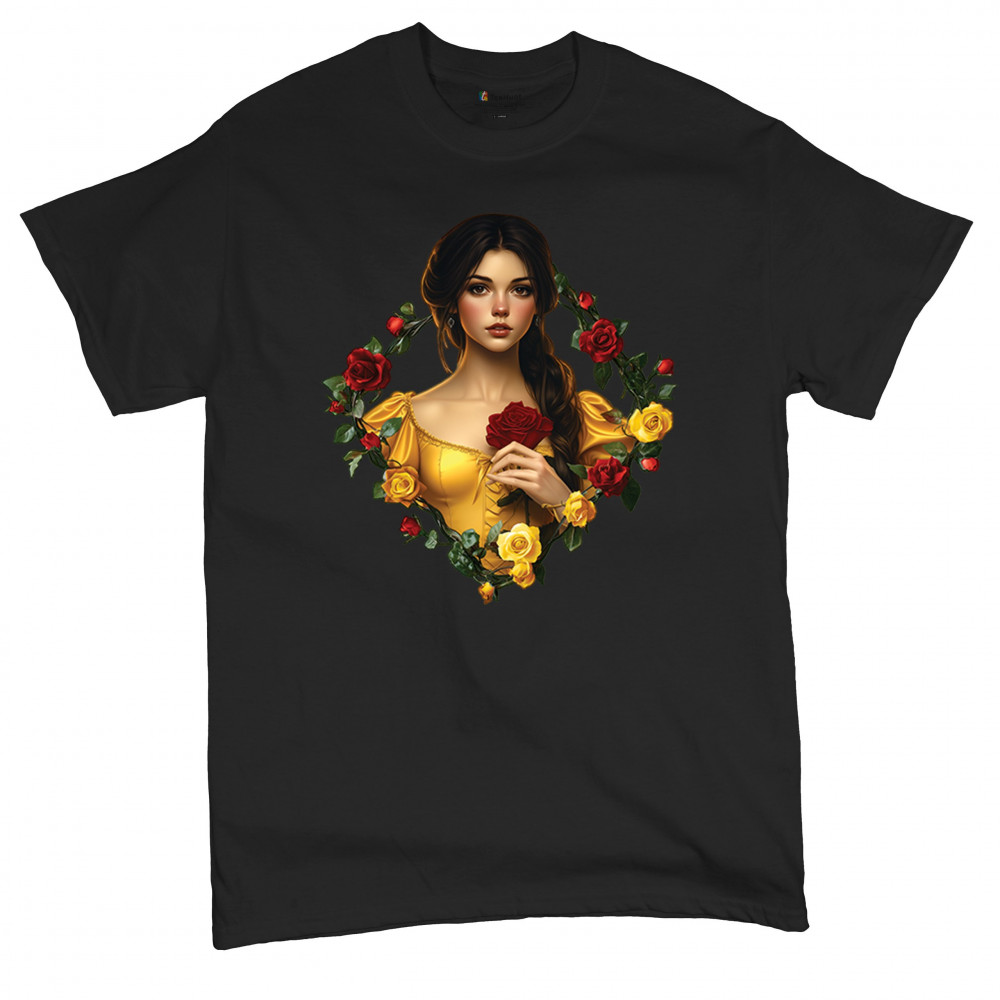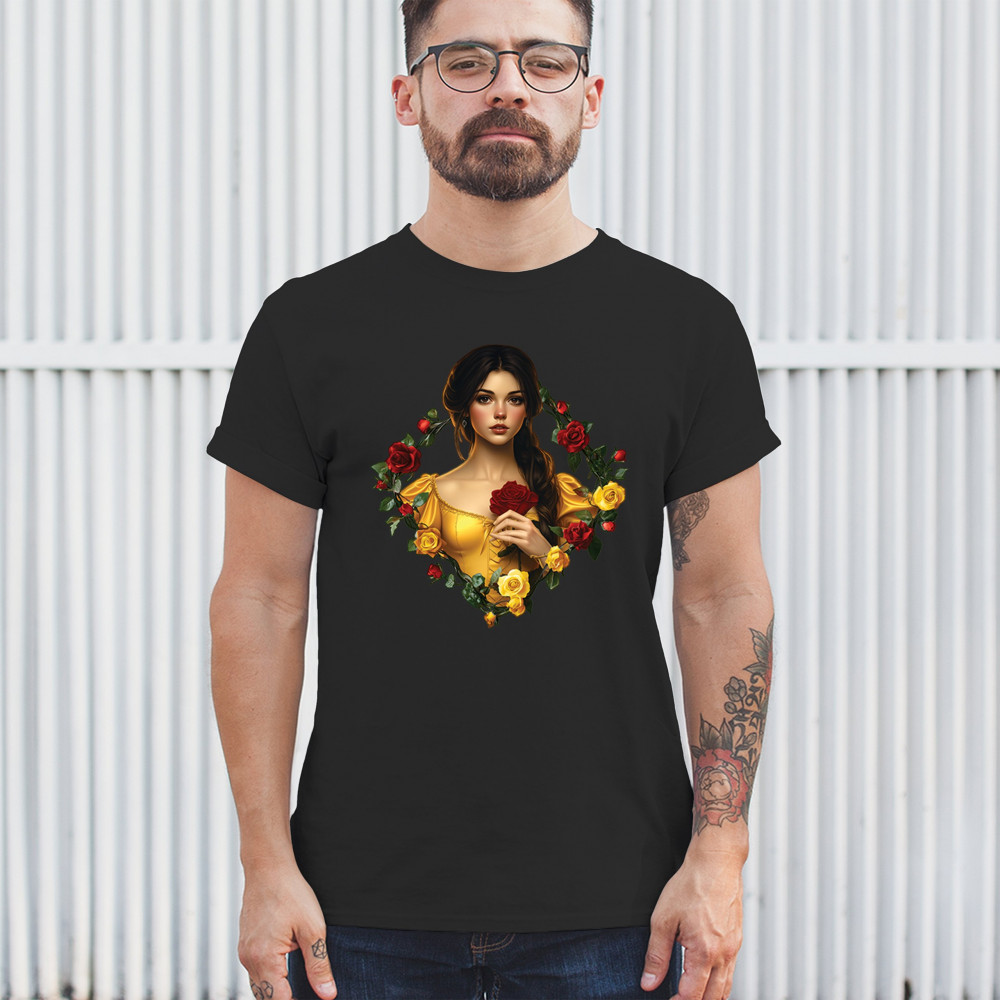 Inspired by classic fairytales, this design features a girl in a yellow gown holding a red rose, framed by rich red and yellow roses. A tribute to Beauty and the Beast, it radiates warmth, romance, and timeless fantasy. Perfect for storybook lovers, enchanted art collectors, or those drawn to magical, symbolic imagery filled with beauty and grace.