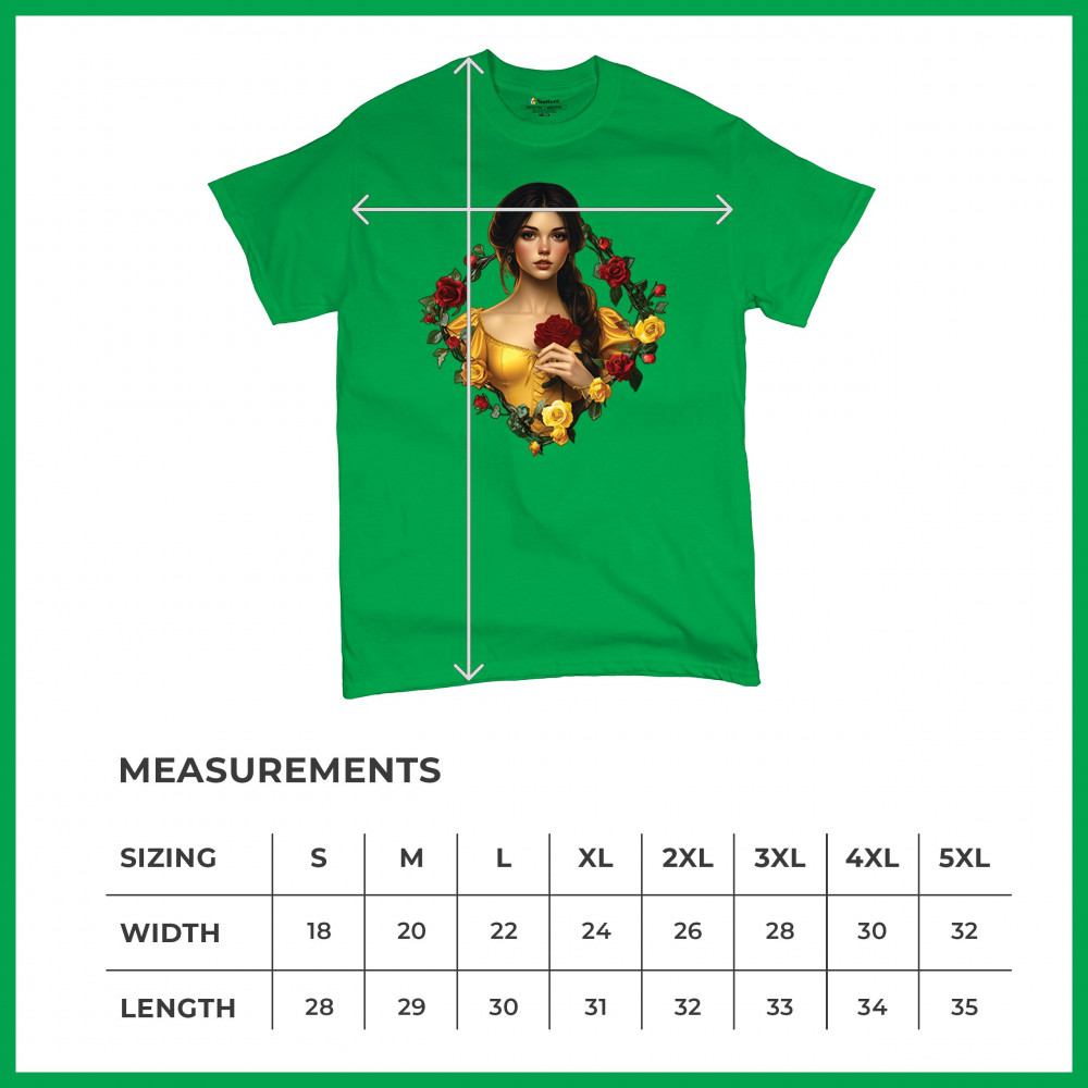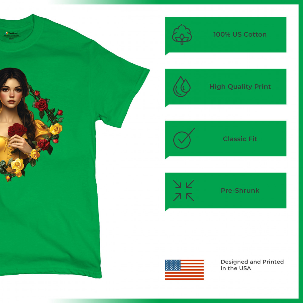 Inspired by classic fairytales, this design features a girl in a yellow gown holding a red rose, framed by rich red and yellow roses. A tribute to Beauty and the Beast, it radiates warmth, romance, and timeless fantasy. Perfect for storybook lovers, enchanted art collectors, or those drawn to magical, symbolic imagery filled with beauty and grace.
