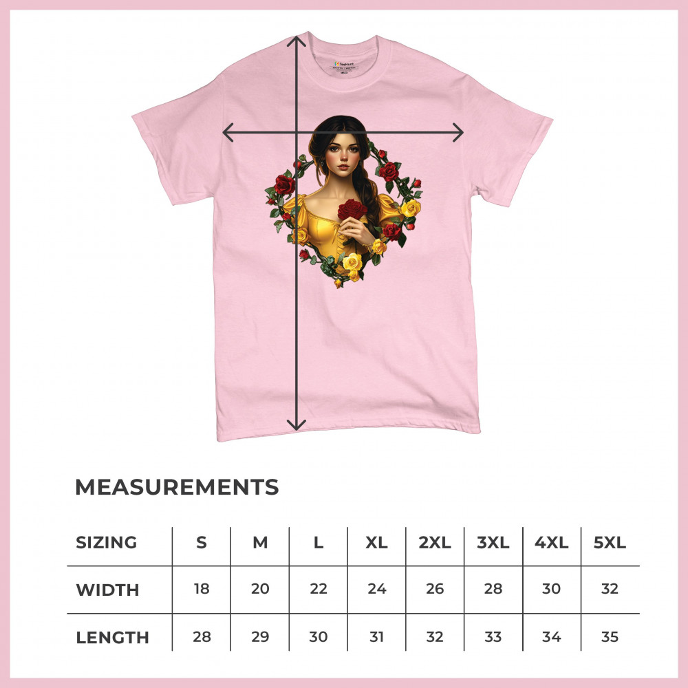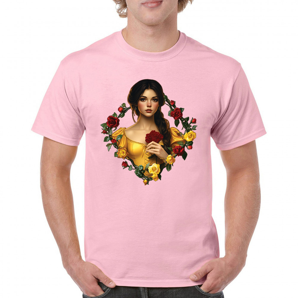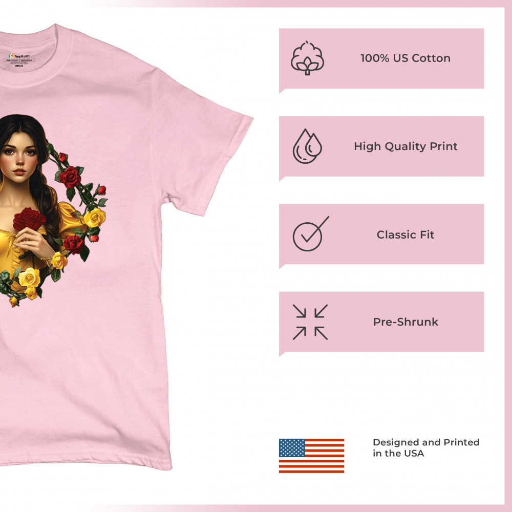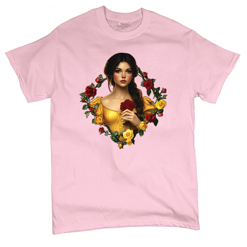 Inspired by classic fairytales, this design features a girl in a yellow gown holding a red rose, framed by rich red and yellow roses. A tribute to Beauty and the Beast, it radiates warmth, romance, and timeless fantasy. Perfect for storybook lovers, enchanted art collectors, or those drawn to magical, symbolic imagery filled with beauty and grace.