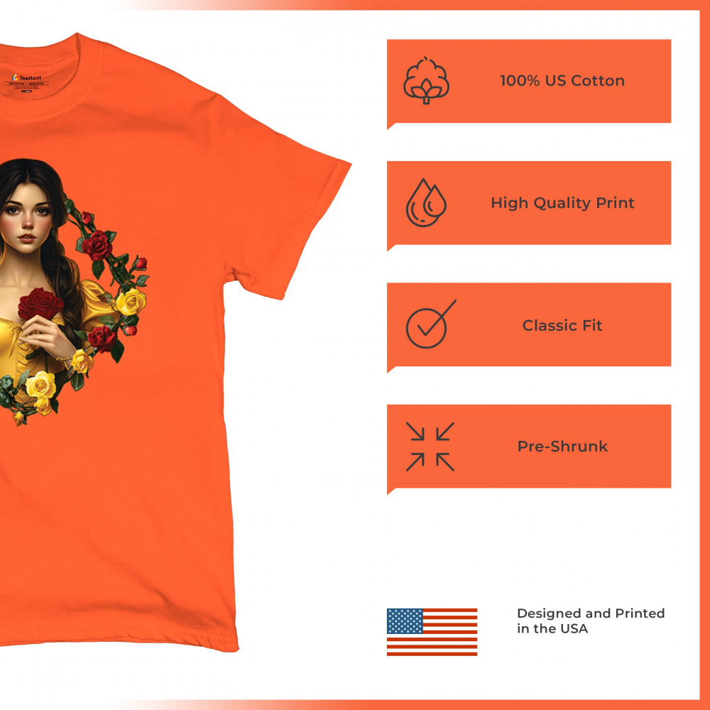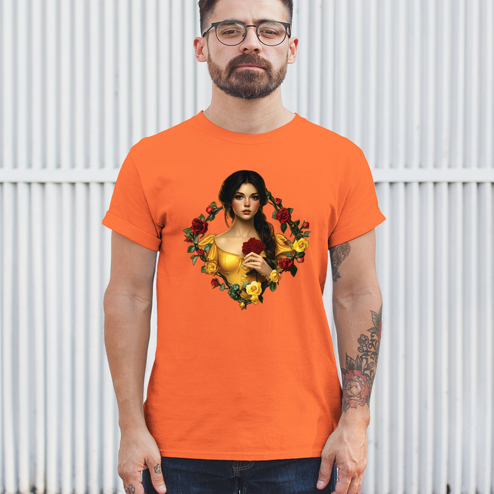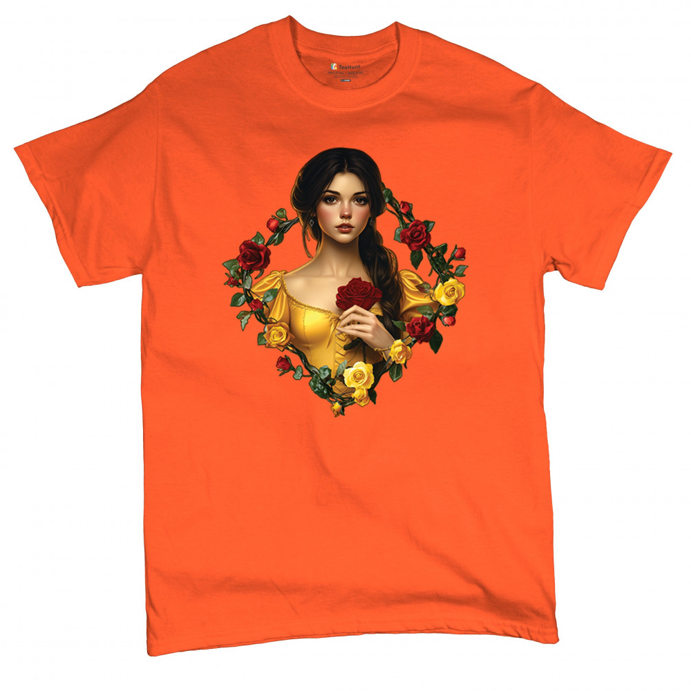 Inspired by classic fairytales, this design features a girl in a yellow gown holding a red rose, framed by rich red and yellow roses. A tribute to Beauty and the Beast, it radiates warmth, romance, and timeless fantasy. Perfect for storybook lovers, enchanted art collectors, or those drawn to magical, symbolic imagery filled with beauty and grace.